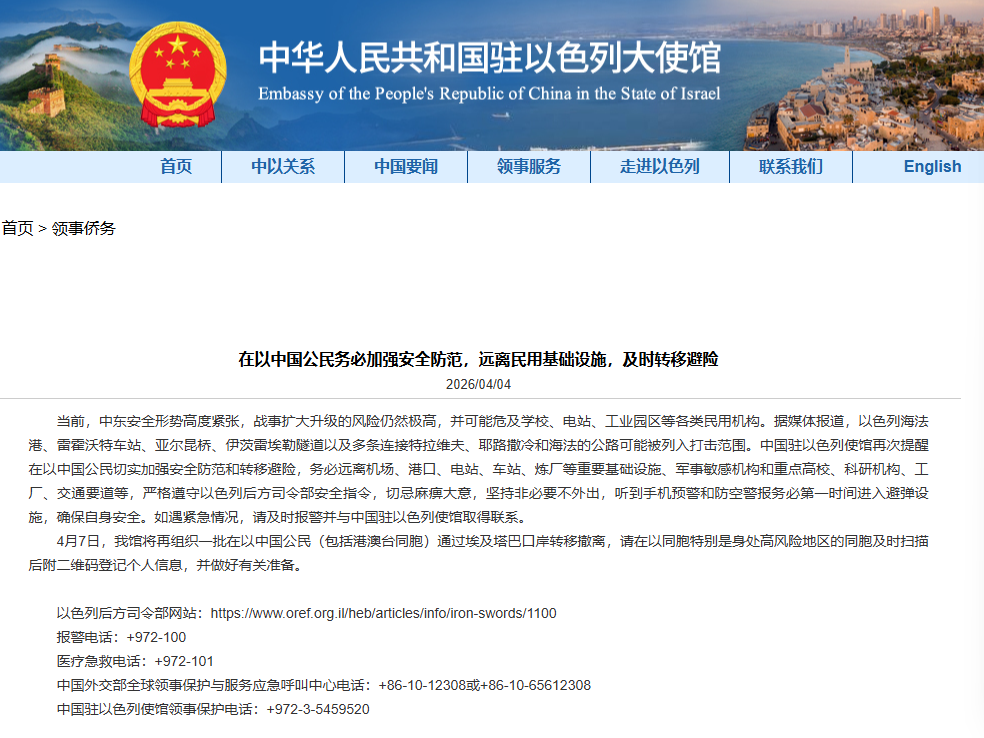 【點新聞報道】據中國駐以色列大使館4月4日消息,當前,中東安全形勢高度緊張,戰事擴大升級的風險仍然極高,並可能危及學校、電站、工業園區等各類民用機構。據媒體報道,以色列海法港、雷霍沃特車站、亞爾昆橋、伊茨雷埃勒隧道以及多條連接特拉維夫、耶路撒冷和海法的公路可能被列入打擊範圍。