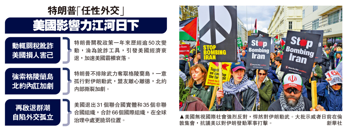 美國窮兵黷武,失道寡助。去年6月,在美國空襲伊朗核設施後,美國《外交政策》刊文說:「世界對華盛頓魯莽且經常是單邊的帝國主義行為感到厭惡。」多項國際民意調查佐證這一觀點,世界各地民眾對美國形象評價大幅下滑。