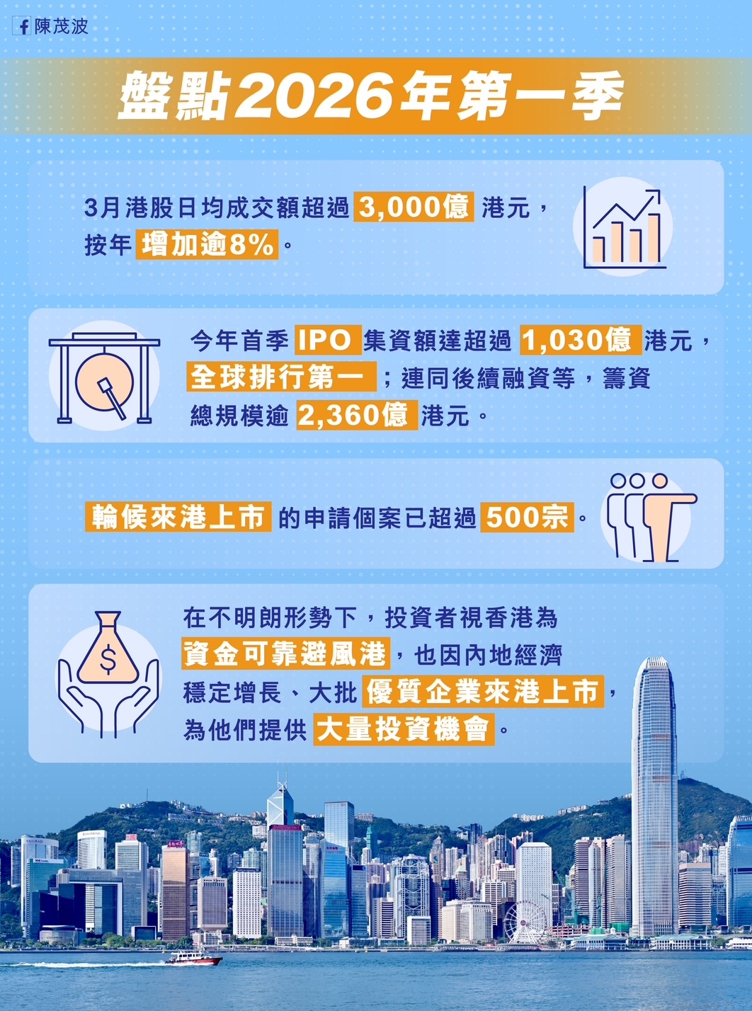 本港今年首季IPO市場延續去年強勢,截至3月27日,集資額已超過1030億港元,全球排行第一;連同後續融資等,籌資總規模約2370億港元。值得一提的是,來港上市企業愈來愈多屬新興產業——人工智能、半導體、機械人、自動駕駛、生物科技等。目前輪候來港上市的申請個案已超過500宗。這說明當外圍環境愈不明朗,更多企業視香港為融資與「出海」發展的重要窗口。