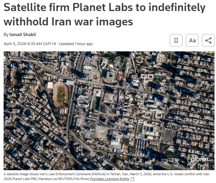 【點新聞報道】總部位於美國三藩市的一家遙感衛星數據公司——星球實驗室(Planet Labs)4月4日宣布,應美國政府要求,將無限期暫停發布伊朗及中東衝突地區的衛星影像。