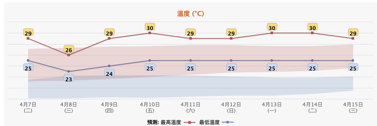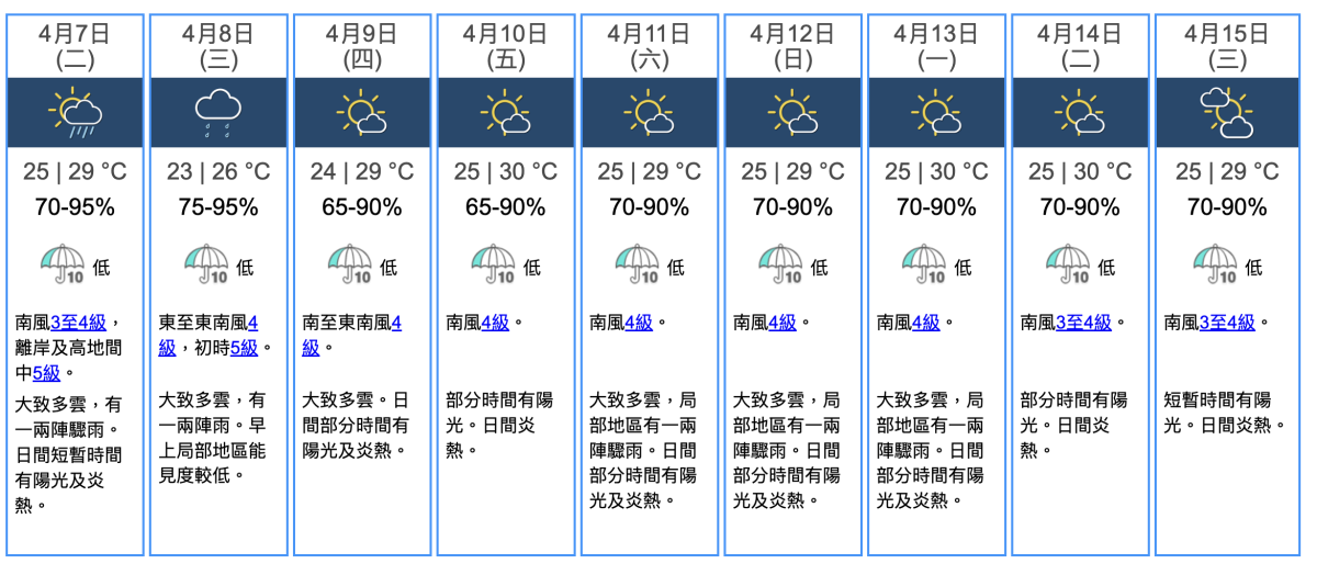 天文台表示,今日天氣大致多雲,有一兩陣驟雨。下午短暫時間有陽光。周三大致多雲,有一兩陣雨,隨後兩三天日間炎熱。