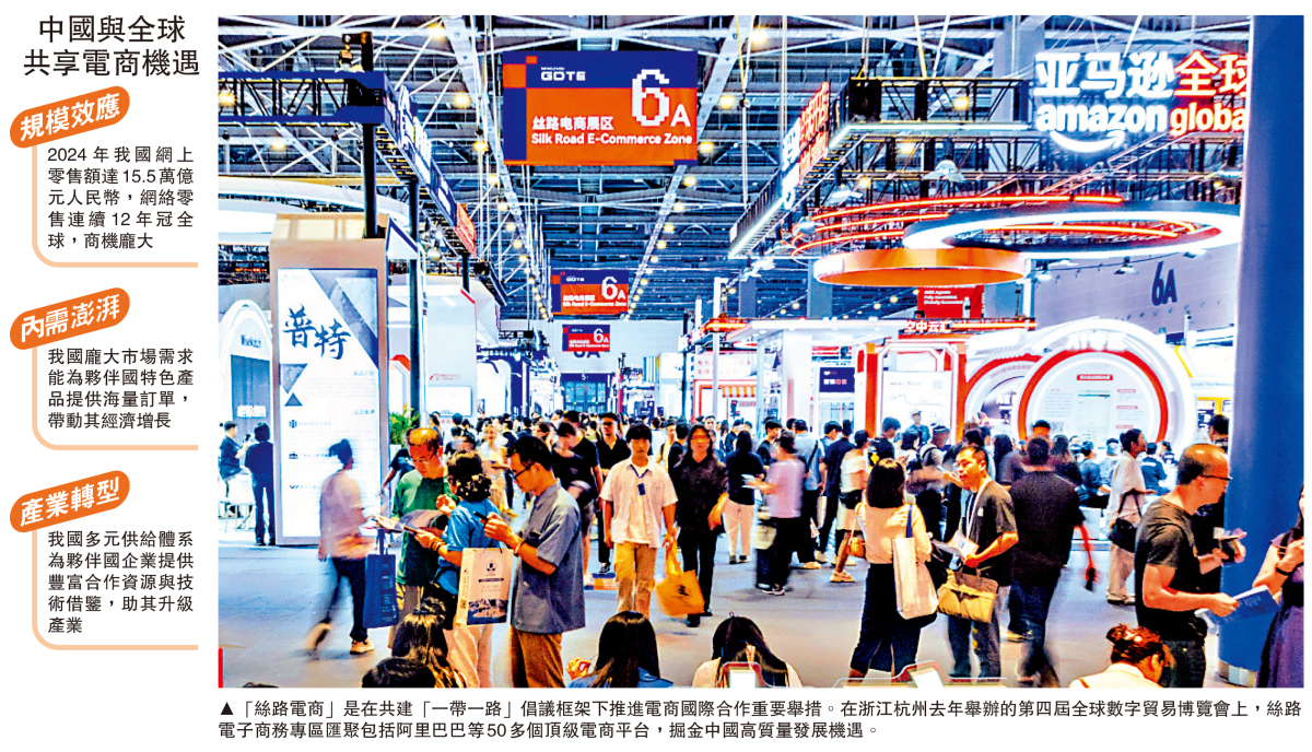 近年,我國電商蓬勃發展,覆蓋國內2600萬商家,服務全球32億消費者,線上線下加速融合。36個「絲路電商」夥伴國遍布全球,跨境電商進出口額佔貨物進出口比重超6%。依託「絲路電商」合作,中國與各方攜手打造「雙品網購節」「絲路雲品」等特色活動,建成120個線上線下國家館,在19個國家建設65個直採基地。2024年,塞爾維亞車厘子對華出口大增90%,價格較歐洲市場溢價20%,惠及逾200果園。