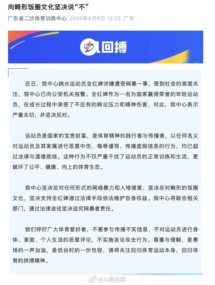 【點新聞報道】廣東省二沙體育訓練中心4月8日發文《向畸形飯圈文化堅決說「不」》: