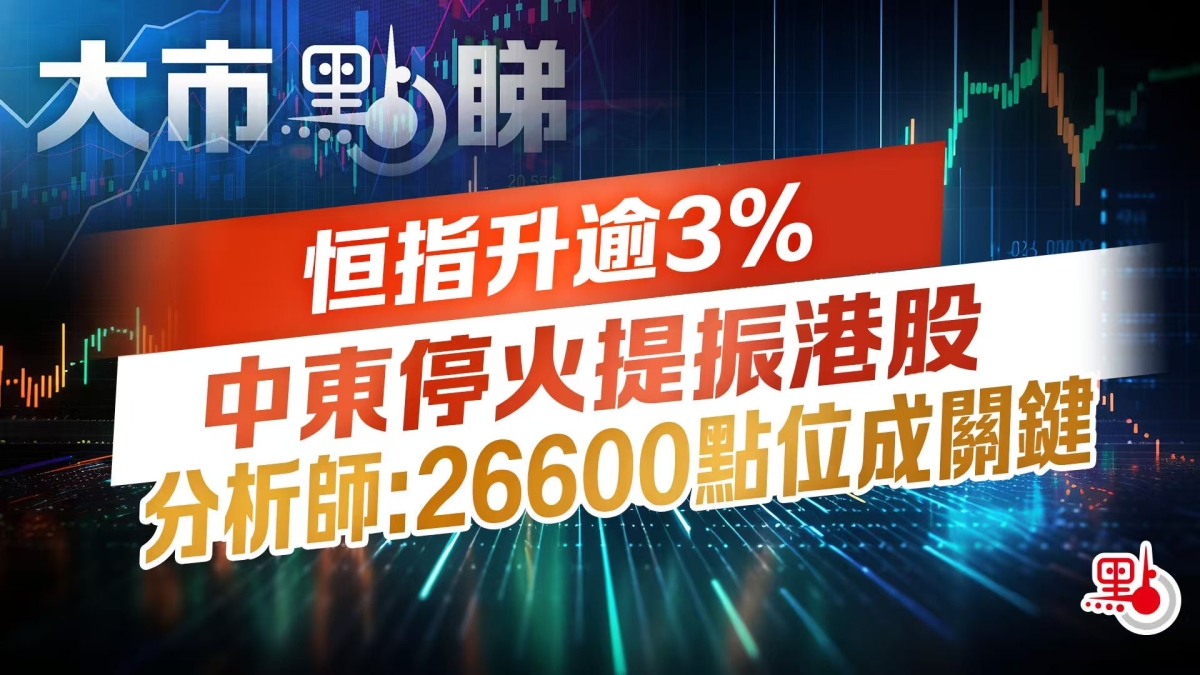 美伊臨時達成停火協議成為今日市場上行的核心推手。東亞證券投資策略師吳永強表示,市場避險情緒隨停火出現明顯回落,帶動股市、黃金等資產反彈、美元走弱,但美伊談判分歧仍大、短期不明朗因素高企,恒指料在26600點遇較大阻力,投資者可趁調整分段吸納優質板塊,中長期仍看好恒指走勢。