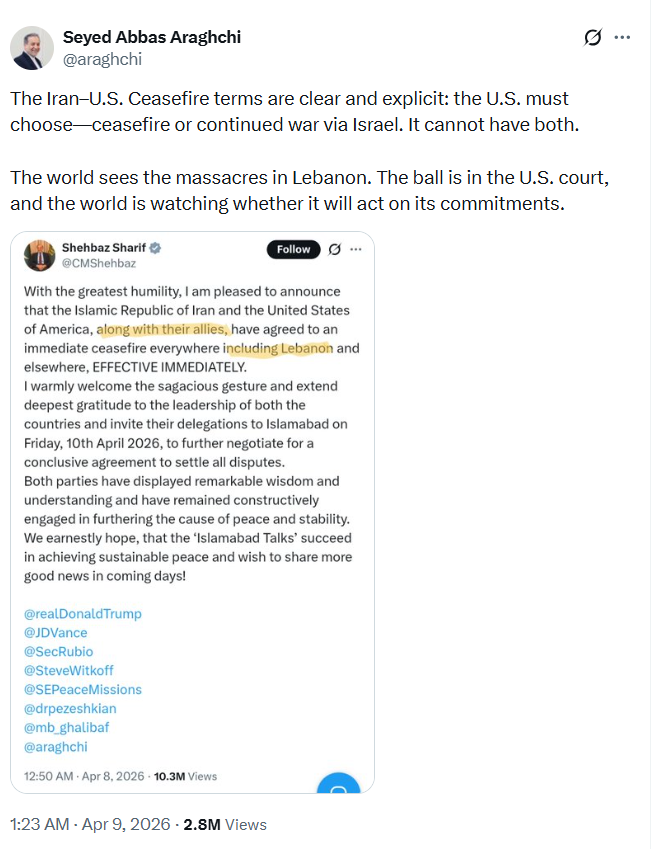 阿拉格齊在帖文中引用了停火調停人巴基斯坦總理夏巴茲·謝里夫的聲明,聲明中說,「伊朗與美國及其盟友已同意在所有地區,包括黎巴嫩及其他地方,立即實施停火,即刻生效。」