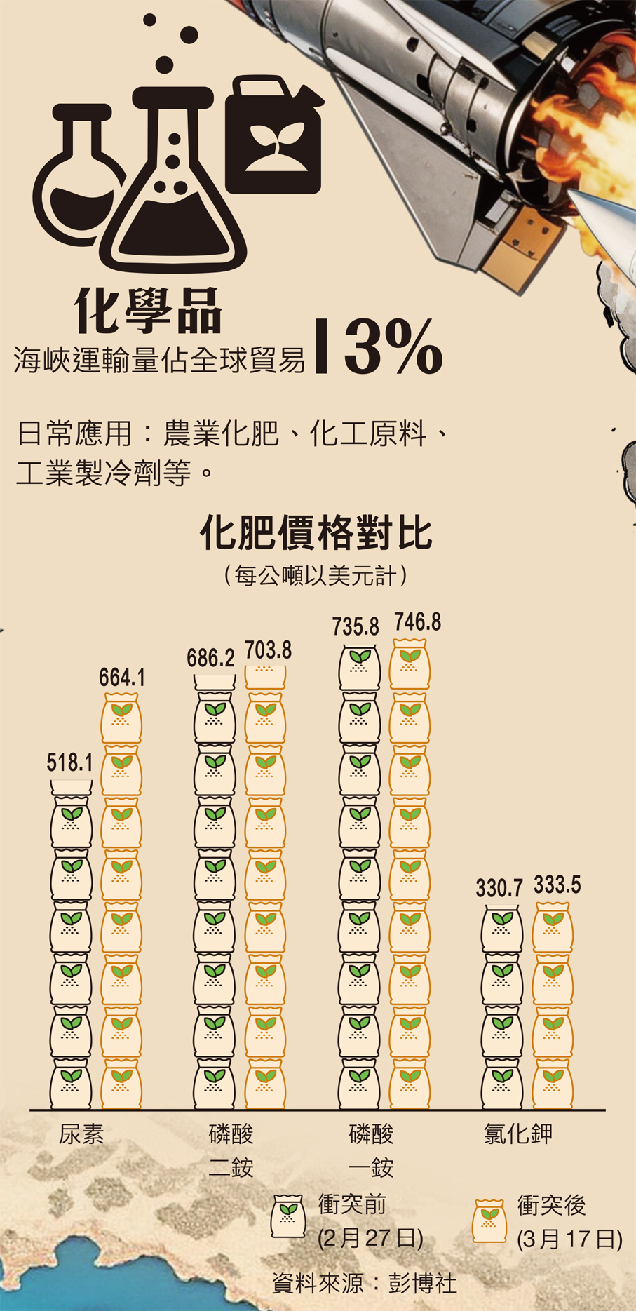 香港文匯報綜合報道,自美國與以色列對伊朗發動軍事打擊以來,霍爾木茲海峽成為這場地緣政治博弈中最劇烈的爆點。伊朗3月2日起實際上封鎖這條全球能源及航運大動脈作回應,至今已達39天,主要波及七大關鍵資源,各項佔全球貿易比例均大。部分供應鏈看似與普羅大眾很遙遠,但相信衝擊已陸續浮面,各國民眾或多或少已在日常生活中感受到這個連鎖效應。香港文匯報特別整理最近各種產品在衝突前後的比較,以數據形式反映具體影響。
