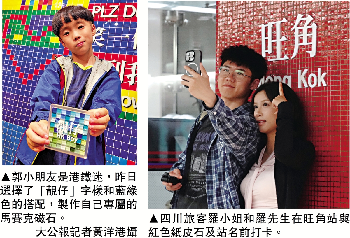 來自四川的羅小姐、羅先生昨日來港旅遊,他們分享透過社交平台的攻略得知港鐵馬賽克牆打卡熱潮,遂將旺角地鐵站列為香港旅遊的第一站,與紅色紙皮石和站名字樣打卡。「感覺是香港最有代表性之一的標誌吧,有種在這裏打卡才能證明自己來過香港,有種『到此一遊』的感覺!」羅先生笑言。