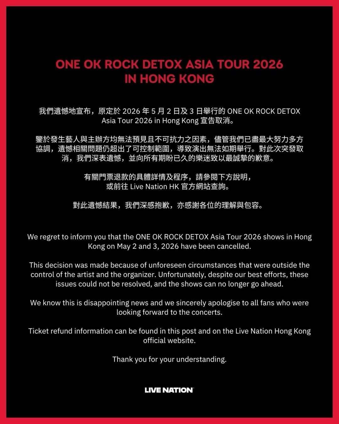 【點新聞報道】由主音Taka領軍的日本搖滾天團ONE OK ROCK(OOR),現正舉行亞洲巡迴演唱會《DETOX Asia Tour 2026》。惟繼上月公布取消上海站後,主辦單位今日(9日)發文,宣布因不可抗力因素,取消原定5月2日及3日在中環海濱活動空間舉行的香港演唱會,令不少期待已久的樂迷十分失望。