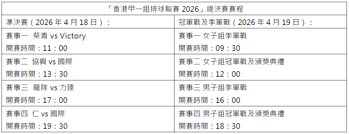 「香港甲一組排球聯賽2026」總決賽將引入外援制,開放予球隊報名增設外援球員參賽;賽會亦首次增設總金額高達港幣20萬元的獎金,令賽事提高競爭性及觀賞性;總決賽亦將使用視像挑戰系統,屆時現場將配合體育展示、強音樂節拍及燈光效果,加上特製排球紀念品,為參賽者及現場觀眾帶來刺激的比賽氛圍。