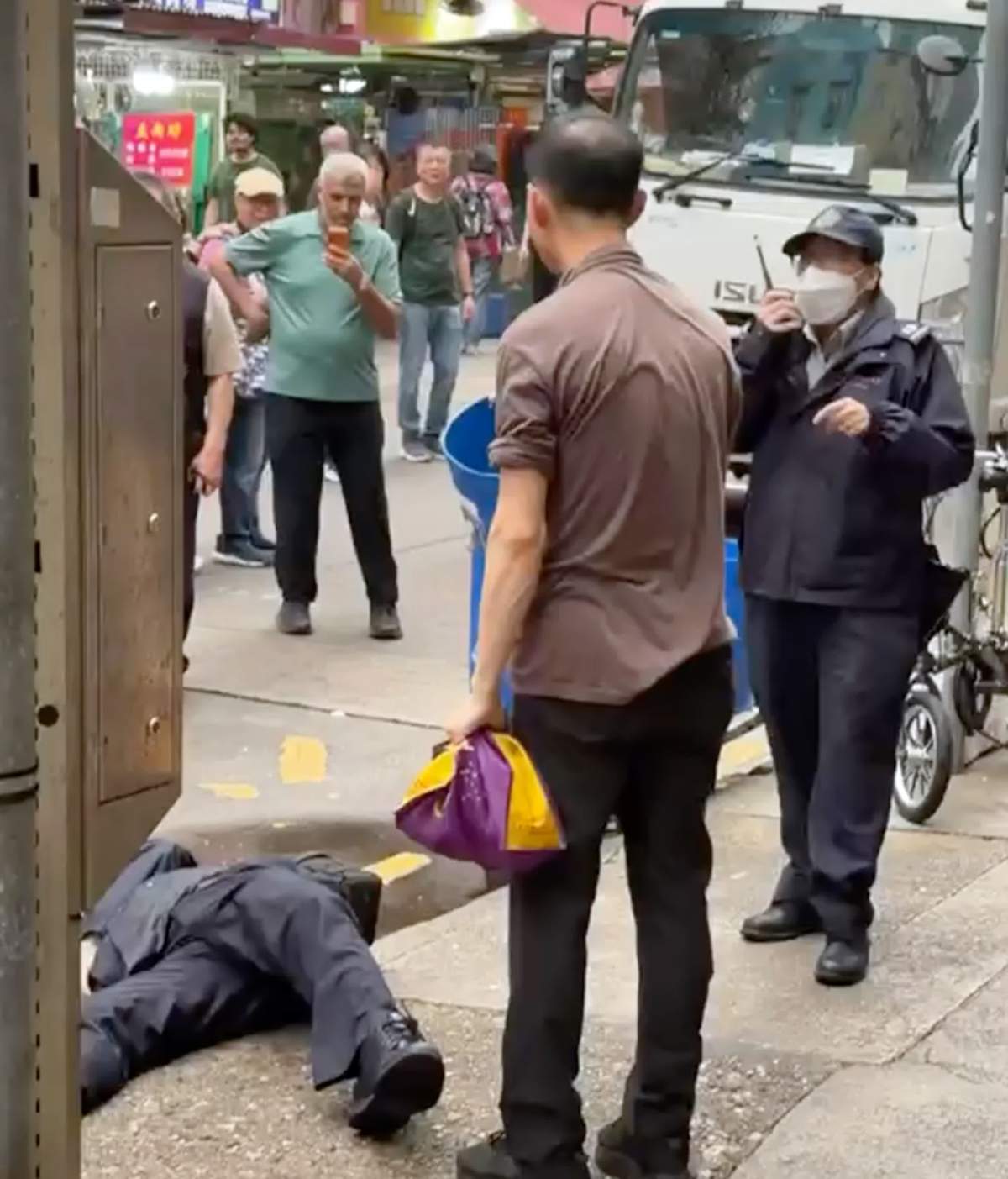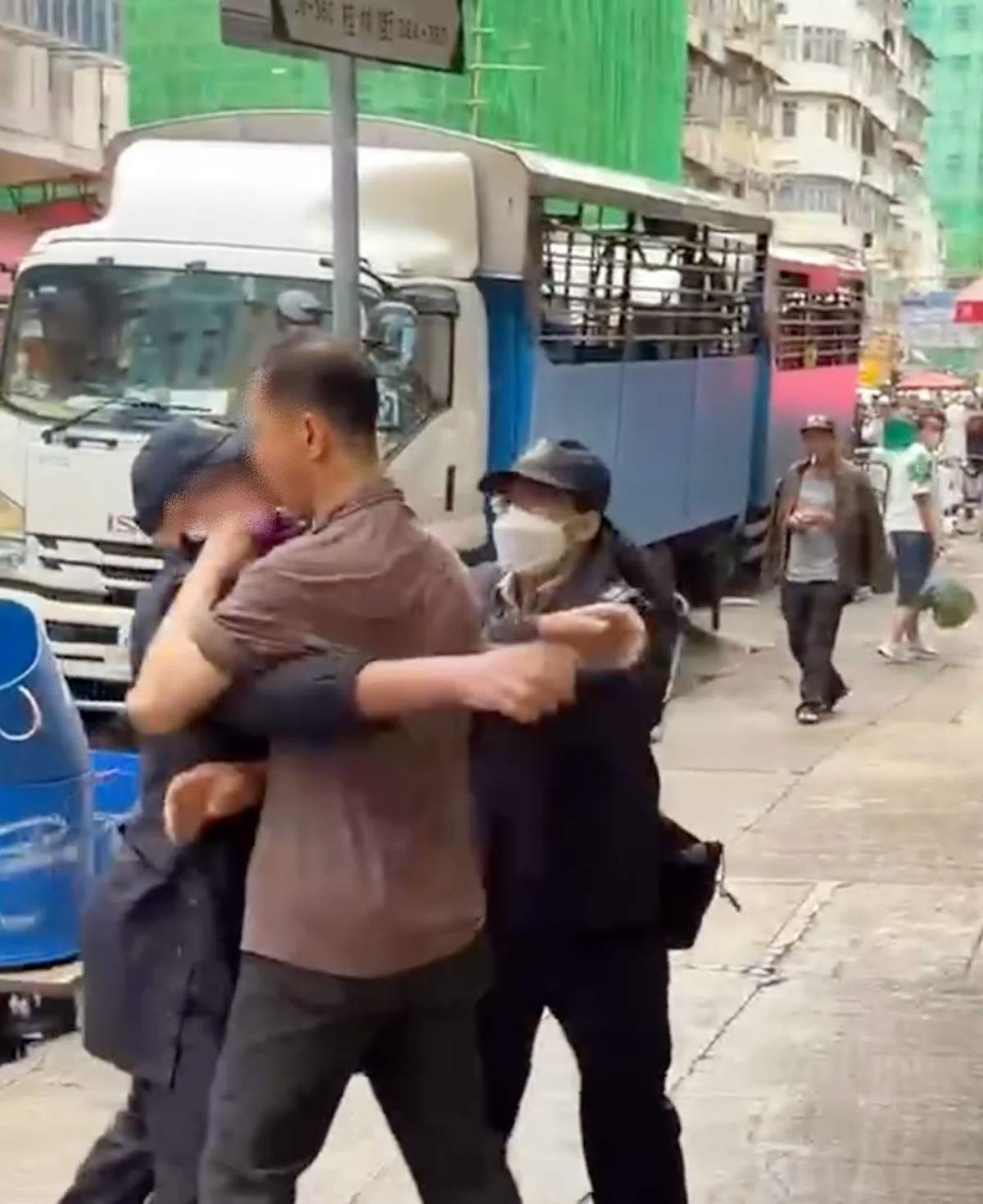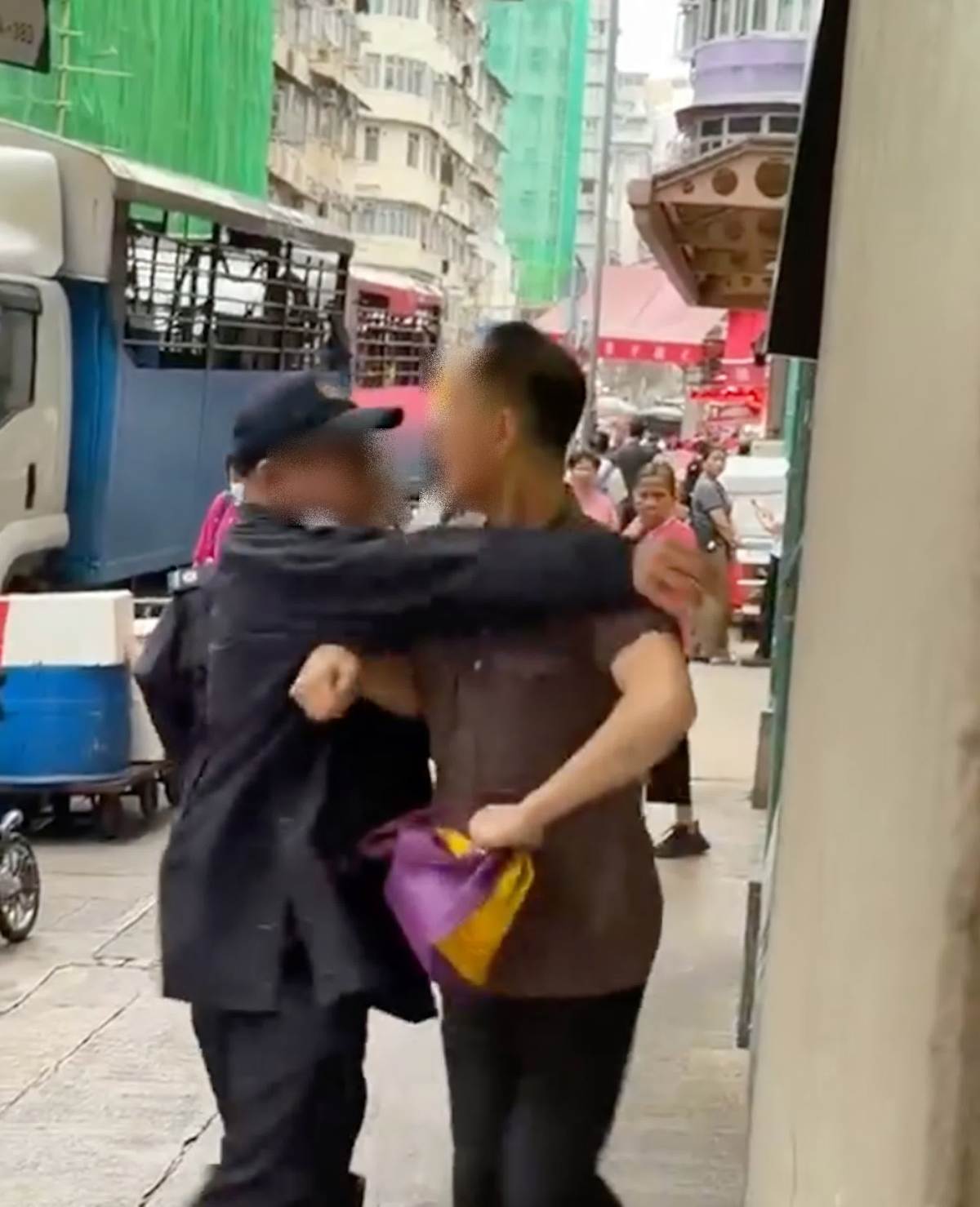 【點新聞報道】昨日(8日)網上流傳一條影片,顯示在深水埗北河街街市對開,兩名男女食物環境衞生署(食環署)職員與一名身穿啡色衫、手持環保袋的男子爭執,期間男職員遭推撞,對方顯得情緒激動,不斷企圖掙脫男職員的阻擋離開。混亂間,男職員遭推跌倒臥路邊石壆受傷,要由同行的女職員報警送往明愛醫院治理,涉嫌施襲的男子則趁機逃去無蹤。警方現正設法追緝該名年約50至60歲的男子歸案。