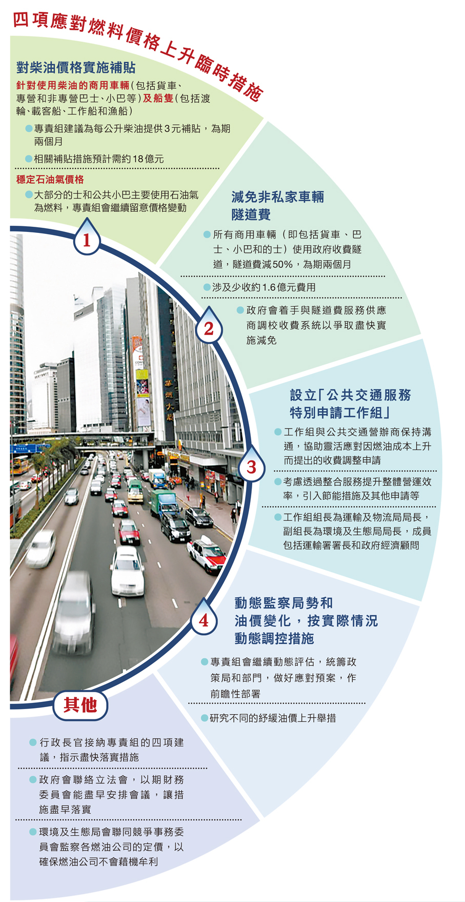 在參考上述原則及審慎平衡包括政府財政和善用公帑的原則等各項因素後,專責組建議四項具針對性的臨時措施(見表),特別對柴油價格進行補貼,因為使用柴油的主要是商用車輛(包括貨車、專營和非專營巴士、小巴等)及船隻(包括渡輪、載客船、工作船和漁船)等,對經濟和民生影響大,故專責組建議政府為每公升柴油提供3元補貼,為期兩個月,以支援以柴油為燃料的公用或商用車輛及船隻和相關工業,減輕其營運成本,亦減低其加價壓力。相關補貼措施預計需約18億元。