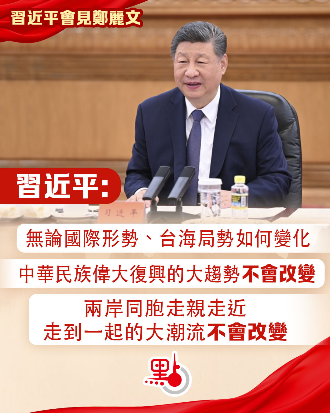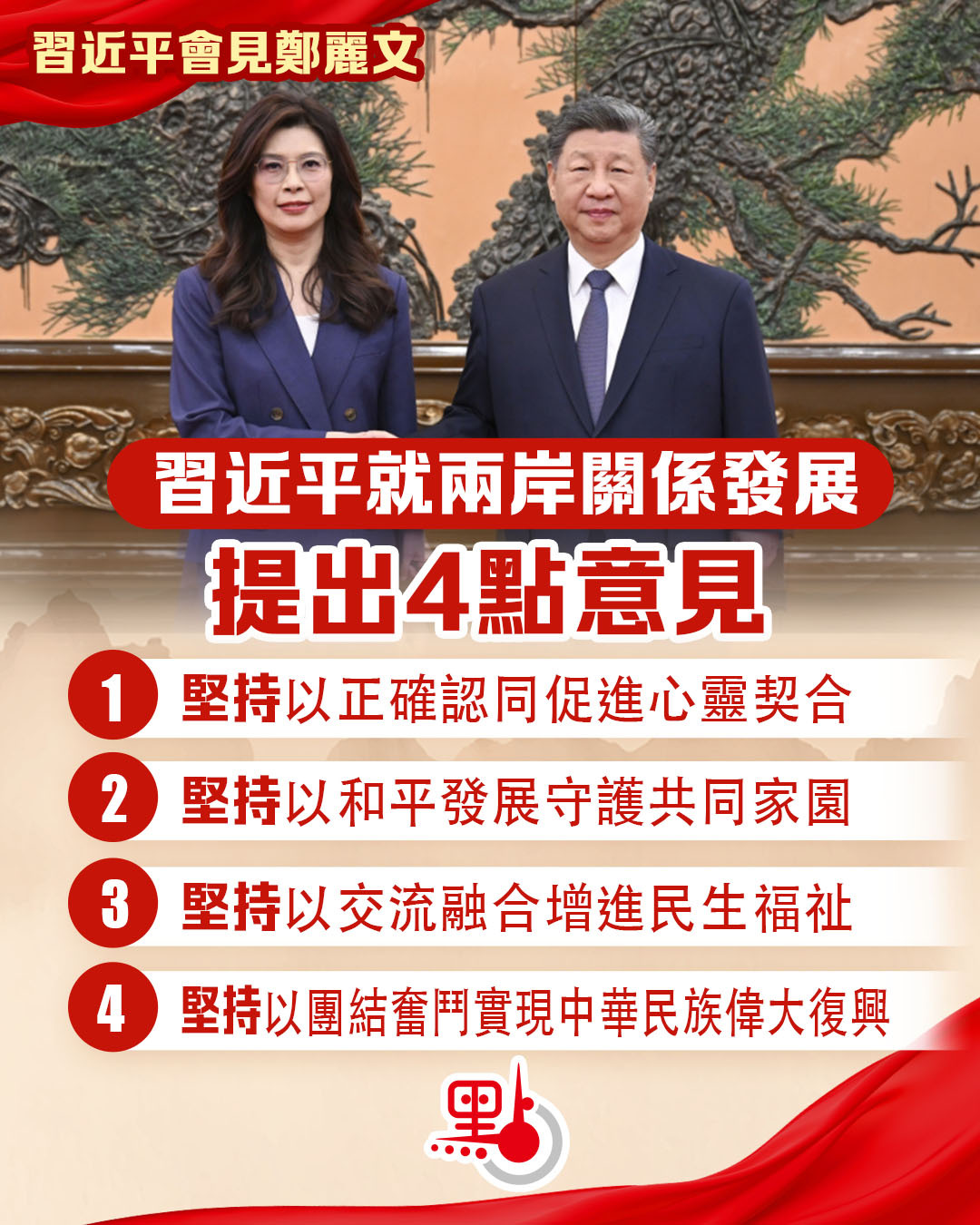 【點新聞報道】中共中央總書記習近平10日上午在北京會見了鄭麗文主席率領的中國國民黨訪問團。習近平總書記的講話都有哪些要點?快來多圖睇清!