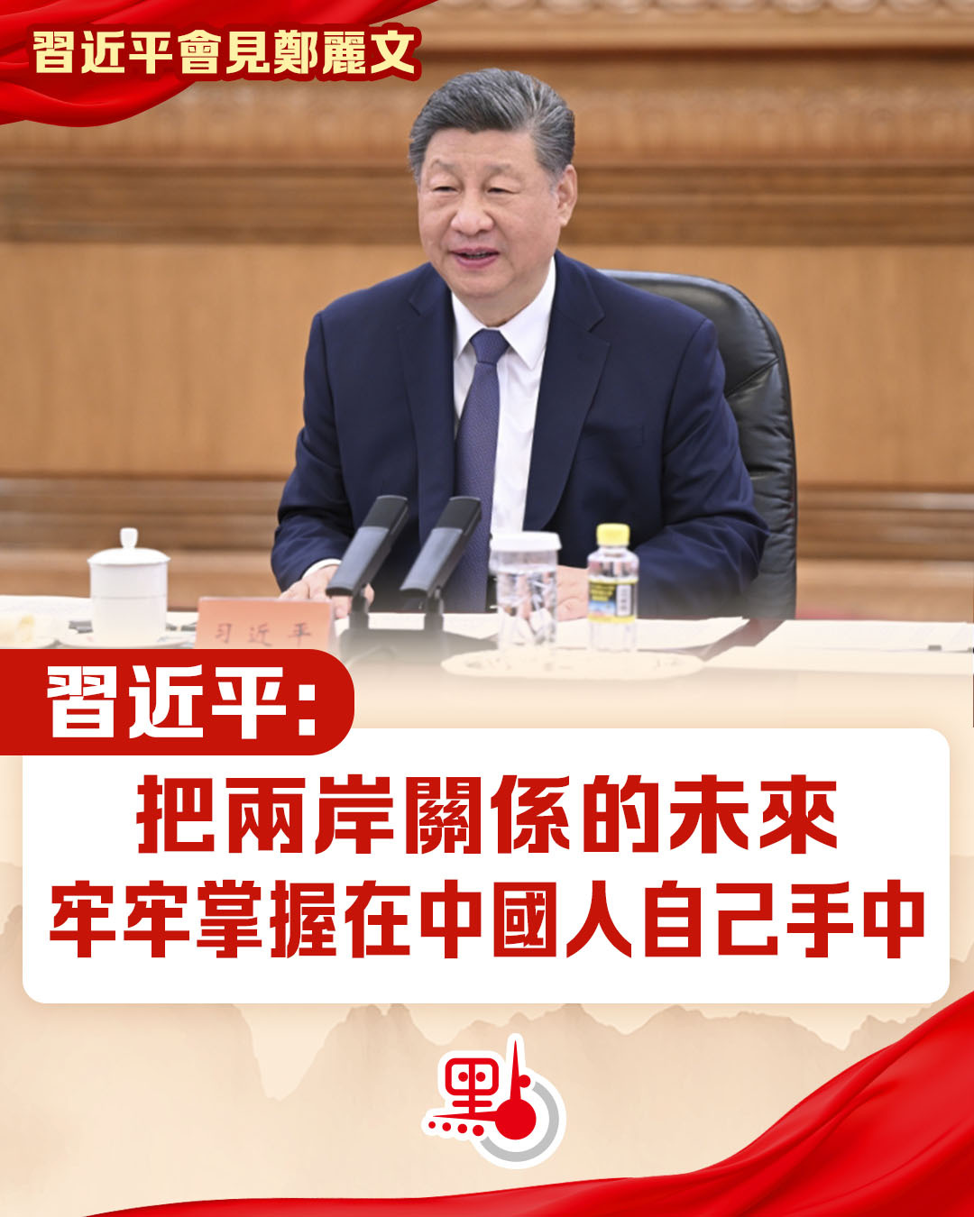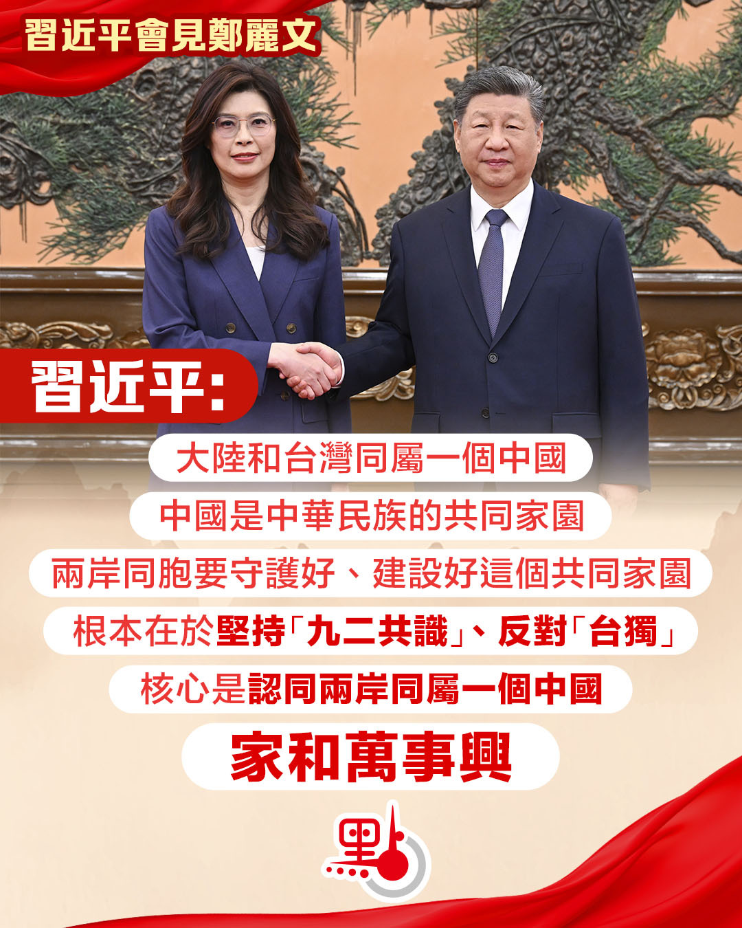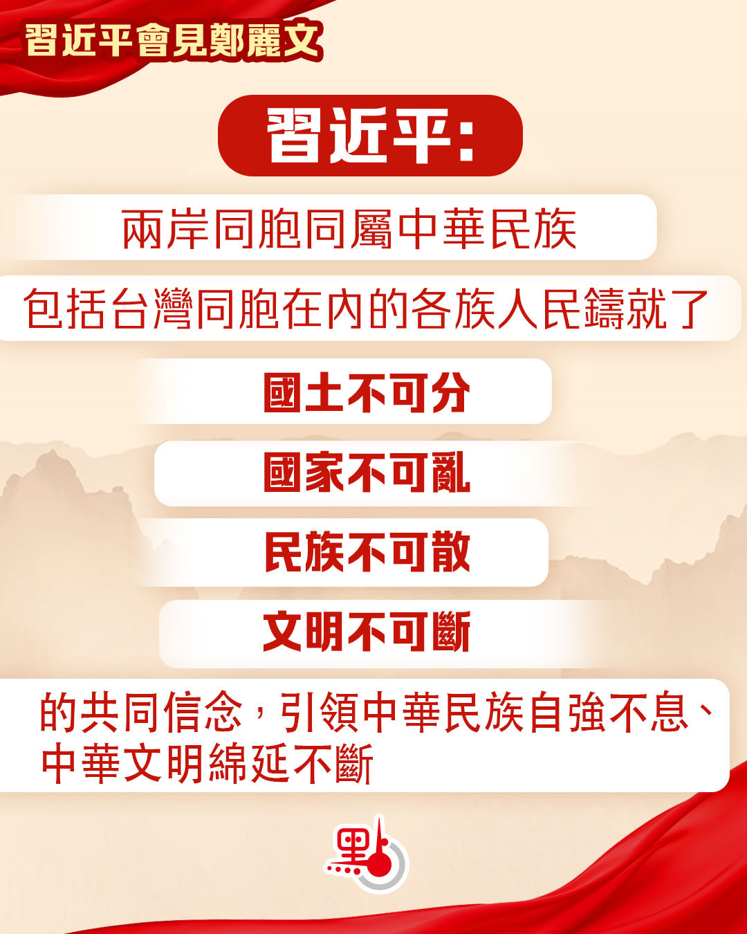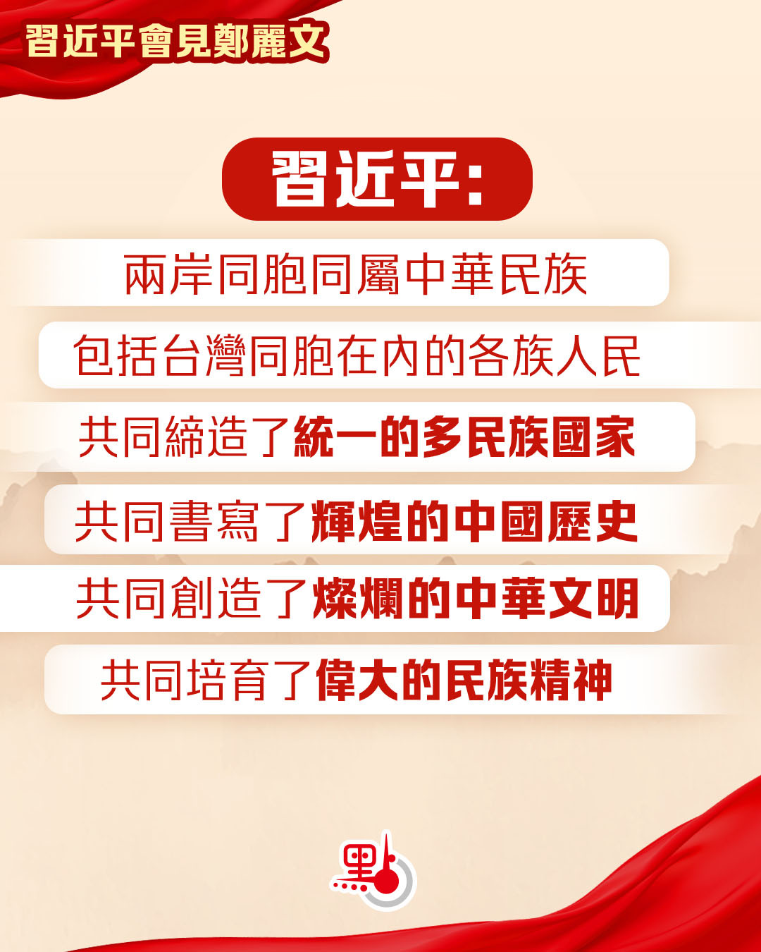 習近平對鄭麗文率團來訪表示歡迎。他指出,國共兩黨領導人時隔10年再次會面,對兩黨關係、兩岸關係發展具有重要意義。兩岸同胞同屬中華民族,包括台灣同胞在內的各族人民共同締造了統一的多民族國家,共同書寫了輝煌的中國歷史,共同創造了燦爛的中華文明,共同培育了偉大的民族精神,也鑄就了國土不可分、國家不可亂、民族不可散、文明不可斷的共同信念,引領中華民族自強不息、中華文明綿延不斷。