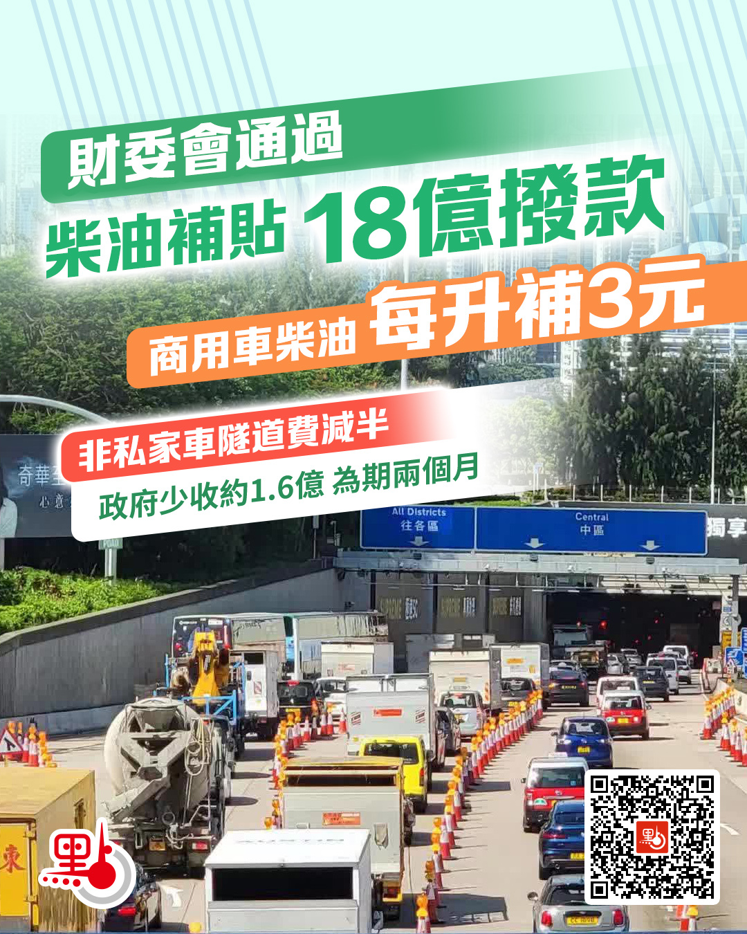 【點新聞報道】中東地區戰事發生後,香港依託背靠祖國的優勢,未有出現「油荒」,但燃油價格大幅上升,運輸業首當其衝,陷入新冠疫情以來最嚴峻的經營挑戰,並可能影響社會民生。香港特區政府急市民所急,早前成立的「跨部門監察燃油供應專責組」建議四項臨時措施應對,包括為每公升柴油提供3元補貼,為期兩個月,相關補貼涉及約18億元。同時,建議政府收費隧道對所有商用車輛減免50%的隧道費,為期兩個月,政府因此少收約1.6億元。立法會財務委員會今日(10日)下午舉行會議,審議並通過有關有時限柴油補貼的緊急撥款建議。