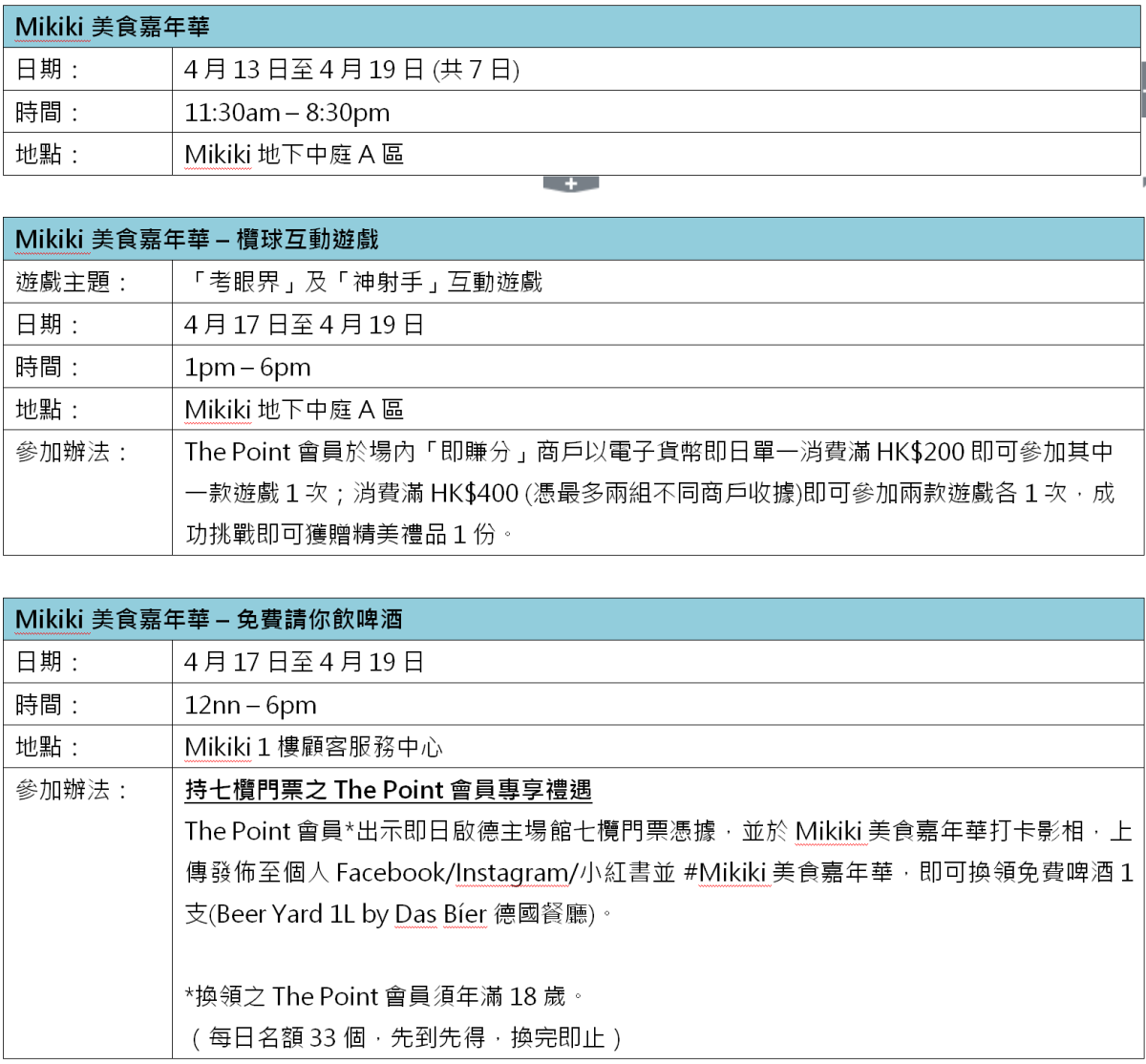 體壇盛事七人欖球賽4月中將於啟德掀起序幕,新蒲崗Mikiki於4月13日至19日一連七日,特別呈獻「Mikiki美食嘉年華」。