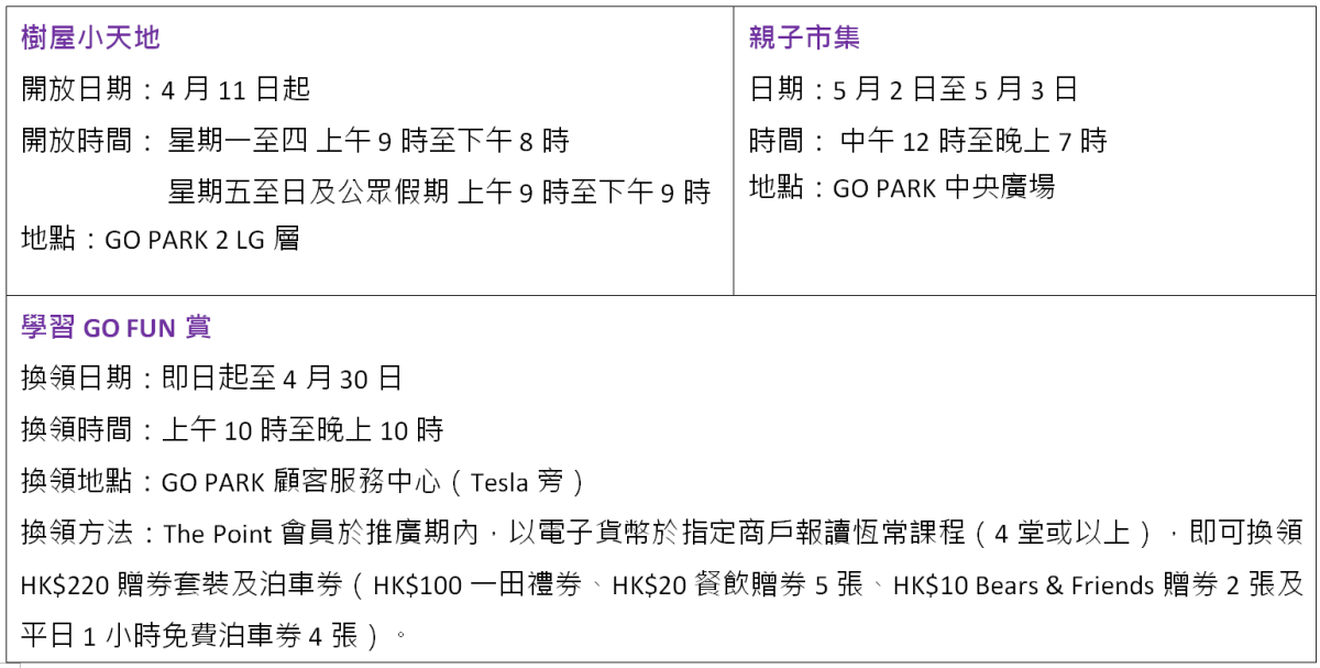 GO PARK 2全新戶外森林樹屋主題親子遊樂場——「樹屋小天地」將於明日(11日)正式登場,配合多所教育商戶,打造以親子教育及運動玩樂為核心的「探索學玩天地」。