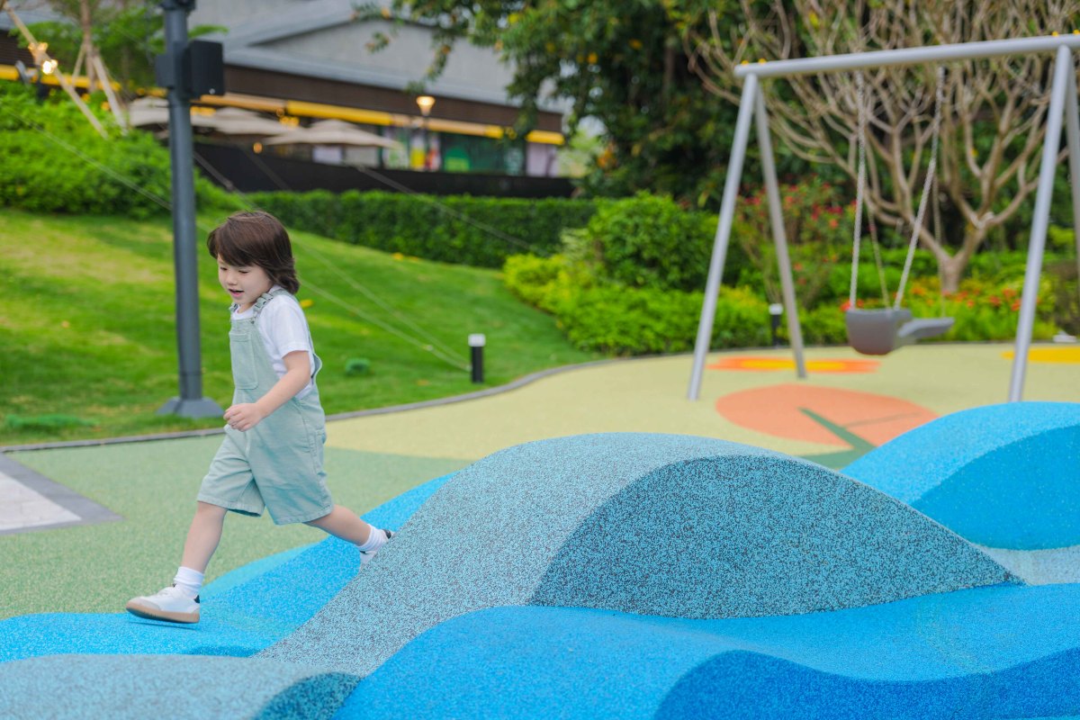 以森林樹屋雙子塔滑梯為主軸的「樹屋小天地」設計,兩座互相呼應的樹屋分別高達近7米及6米,連接旋轉滑梯與開放式滑梯,孩子從3.6米高的滑梯一滑而下,彷彿穿越奇幻森林,展開歷奇探索之旅。場內其他遊玩設施還包括叢林鞦韆、蘑菇攀爬架及波浪平台,挑戰孩子的平衡能力與膽量。整個公園色彩與圖案採用鮮明色系與地面圖案(蘑菇、湖泊、花叢),讓孩子在玩樂中全面成長,盡情探索的奇趣空間。