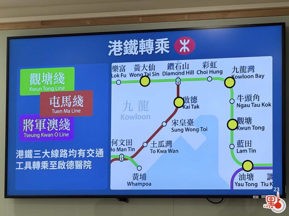 九龍中醫院聯網行政事務總經理雷沛然提到,啟德醫院公共交通網絡發達,共有14條公共交通路線,包括8條巴士線和6條小巴線,覆蓋九龍區主要的區域。港鐵觀塘綫、屯馬綫及將軍澳綫亦均有交通工具轉乘到達,相信方便市民就診。