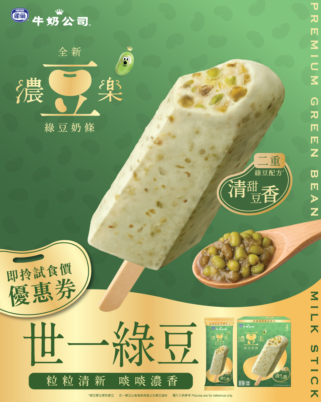 【點新聞報道】雀巢牛奶公司歷經長達一年研發並推出「濃豆樂」系列全新成員——「濃豆樂」綠豆奶條,並宣布由4月11日起,一連三個周末於全港多個旺區大玩快閃,免費派發逾5000支雪條。