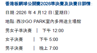 「香港板式網球公開賽 2026」是香港首個官方本地排名賽,賽事積分將成為中國香港板式網球總會進行港隊選拔的重要參考依據。賽事為本地球員建立正式排名制度,與國際標準接軌,讓運動員能更清晰地定位自身實力,為未來國際賽事做好準備。公開組設有32個籤位,青少年組別涵蓋U12、U14、U16,以混合性別形式進行。
