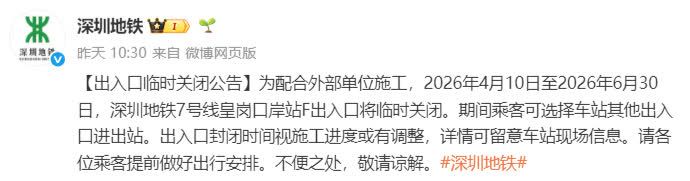 根據公告,關閉時間為2026年4月10日至2026年6月30日,視施工進度或有調整,詳情可留意車站現場信息,關閉期間乘客可選擇車站其他出入口進出站。