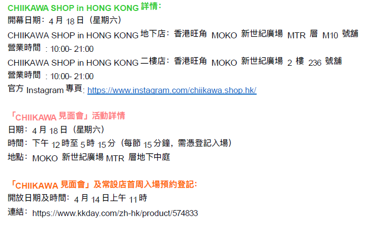 【點新聞報道】CHIIKAWA粉絲注意!「CHIIKAWA SHOP in HONG KONG」將於4月18日在MOKO新世紀廣場開幕。為慶祝首間常設店登陸香港,CHIIKAWA角色將於4月18日(星期六)驚喜登場,與粉絲近距離互動。常設店首周及「CHIIKAWA 見面會」均採用全預約制,系統將於4月14日(星期二)早上11時開放。