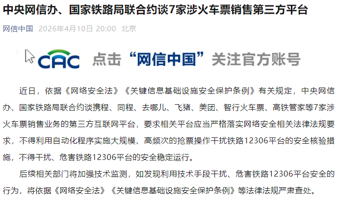 【點新聞報道】近日,依據《網絡安全法》《關鍵信息基礎設施安全保護條例》有關規定,中央網信辦、國家鐵路局聯合約談攜程、同程、去哪兒、飛豬、美團、智行火車票、高鐵管家等7家涉火車票銷售業務的第三方互聯網平台,要求相關平台應當嚴格落實網絡安全相關法律法規要求,不得利用自動化程序實施大規模、高頻次的搶票操作干擾鐵路12306平台的安全核驗措施,不得干擾、危害鐵路12306平台的安全穩定運行。