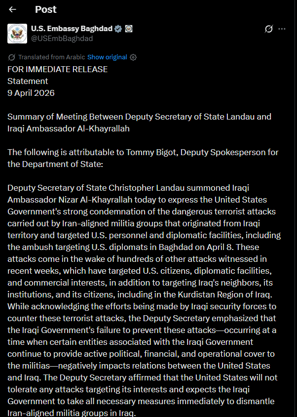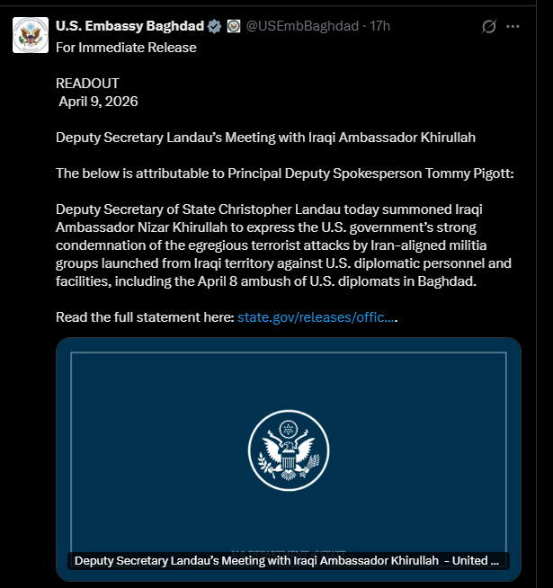 聲明稱,美國常務副國務卿克里斯托弗·蘭多當天召見伊拉克駐美大使尼扎爾·希魯拉,「代表美國政府強烈譴責親伊朗民兵組織從伊拉克境內對美國外交人員及設施發動嚴重恐怖襲擊」。聲明稱,此前數周內,伊拉克境內已發生數百起針對美國公民、外交設施、商業利益等的襲擊。