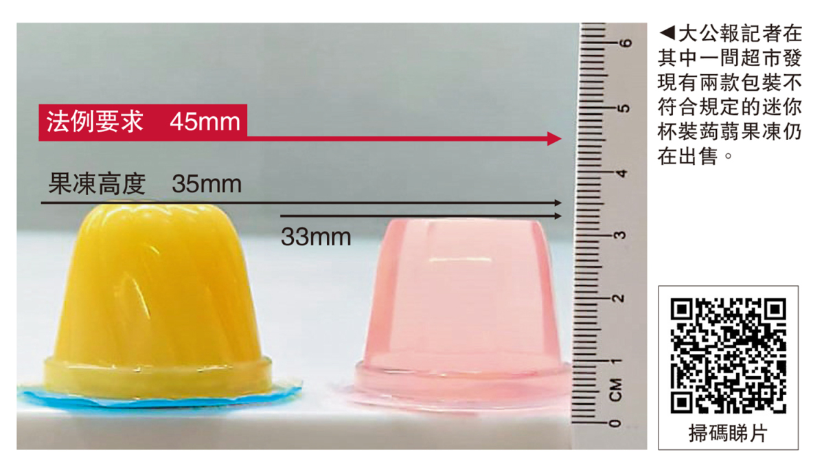 迷你杯裝蒟蒻果凍本月起禁止在港出售,旨在防止兒童與長者哽噎。新例實施一周後,大公報記者連日走訪多區,發現有位於紅磡的連鎖超市,仍出售高度或闊度均不超過45毫米的杯裝蒟蒻果凍,懷疑違反新例,而店員聲稱對新例毫不知情。