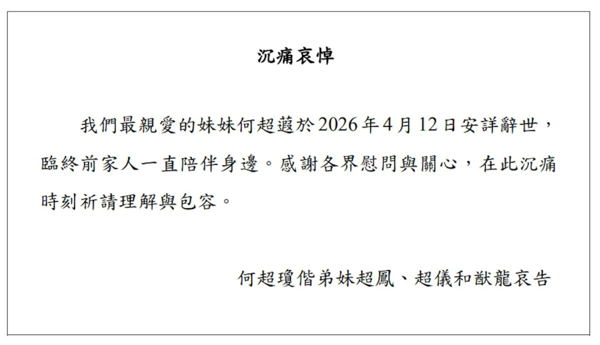 由何超蕸出任執行董事的信德集團,沉痛哀悼何超蕸逝世,並附上家人通告指:「我們最親愛的妹妹何超蕸於2026年4月12日安詳辭世,臨終前家人一直陪伴身邊。感謝各界慰問與關心,並指在此沉痛時刻祈請理解與包容。」