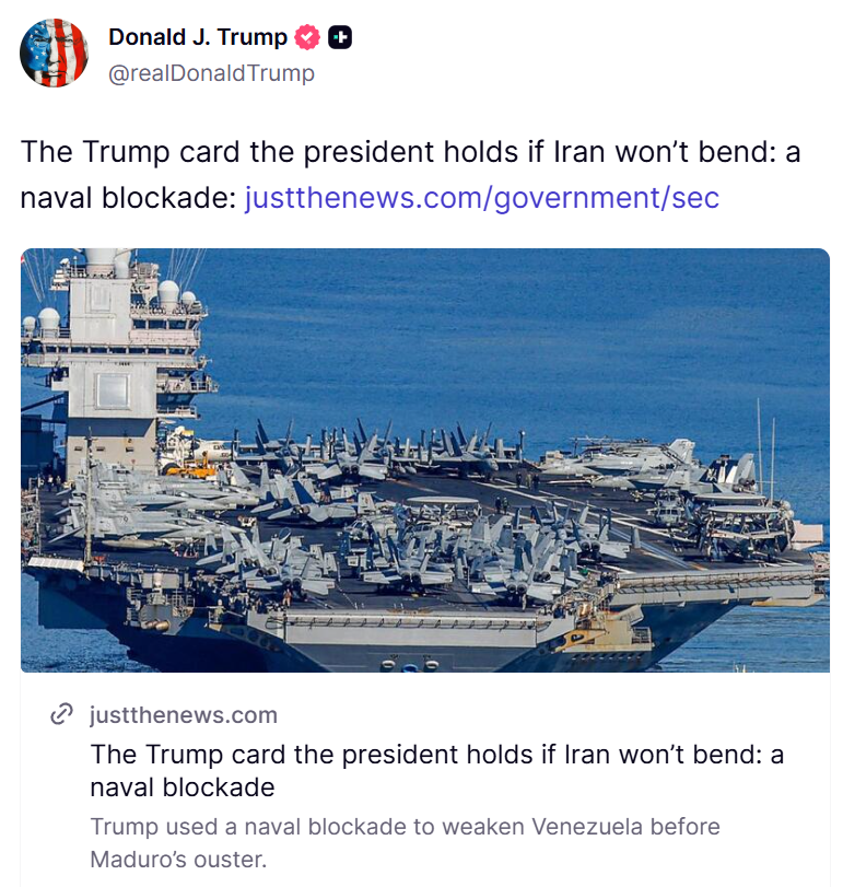 【點新聞報道】據央視新聞消息,當地時間12日,美國總統特朗普在其社交媒體上轉發一篇文章稱,如果伊朗拒絕妥協,那麼其手中的王牌或為通過美國海軍控制霍爾木茲海峽,禁止伊朗油輪進出,從而打擊伊朗經濟。