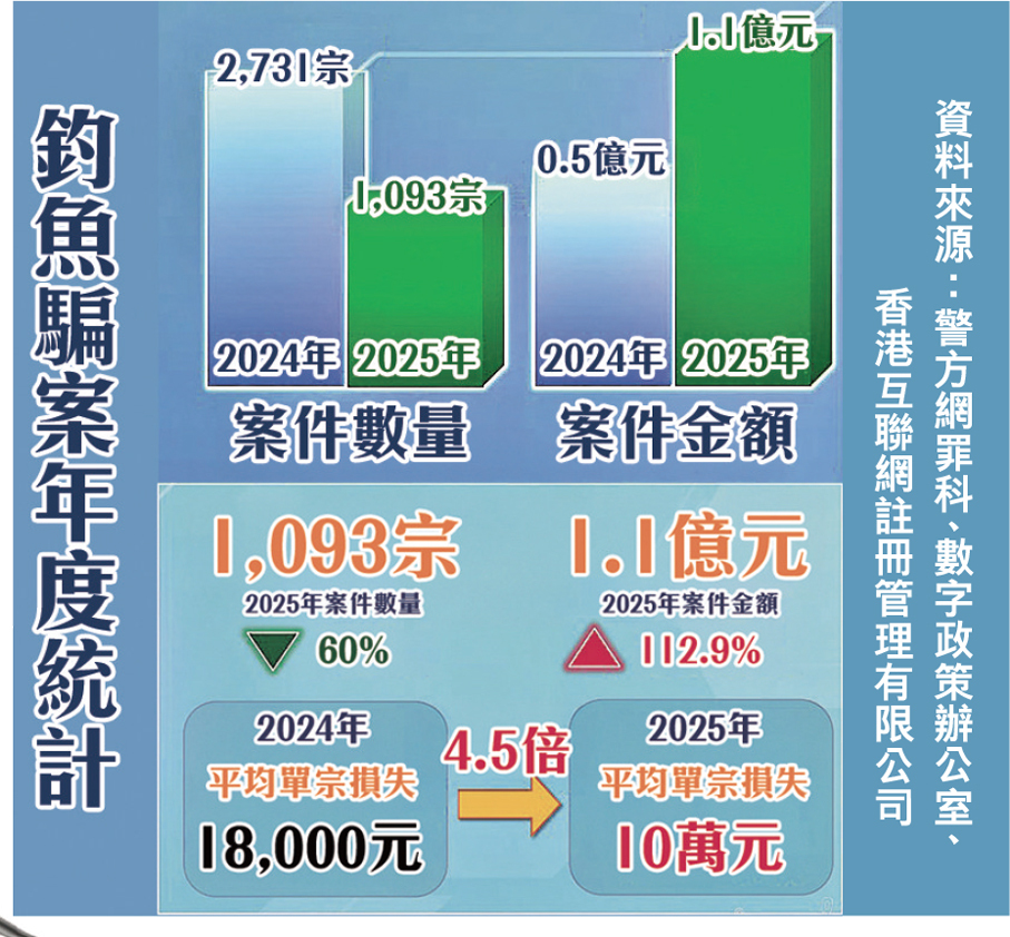 香港「釣魚」騙案報案從前年的2,731宗,下跌至去年的1,093宗,但損失金額則由前年約5,000萬元,上升至去年的1.1億元。騙徒會設計「釣魚」連結引導受害人在假網站輸入證券戶口、網上銀行或信用卡登入資料以盜取更多款項,市民一旦登入「釣魚」連結便會「輸身家」。
