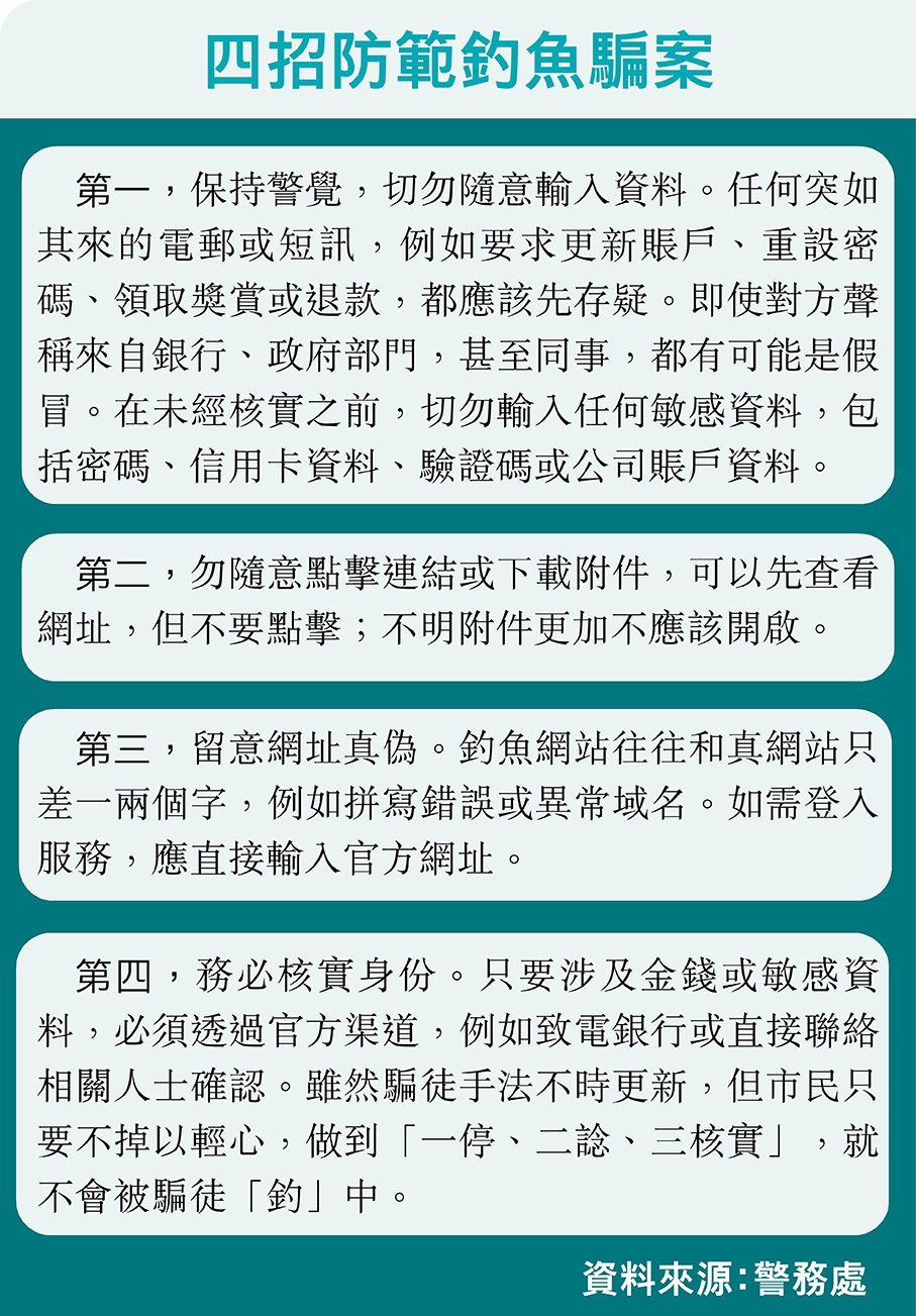 因應「釣魚」攻擊的不斷演變及高風險,警方由去年10月至今年1月,聯同香港互聯網註冊管理有限公司(HKIRC)及數字政策辦公室舉辦「『釣爾輕心』社交工程演習2025」,共有301間機構逾5萬人參與,目標透過模擬真實騙案情況,提升員工對「釣魚」攻擊的警覺性。