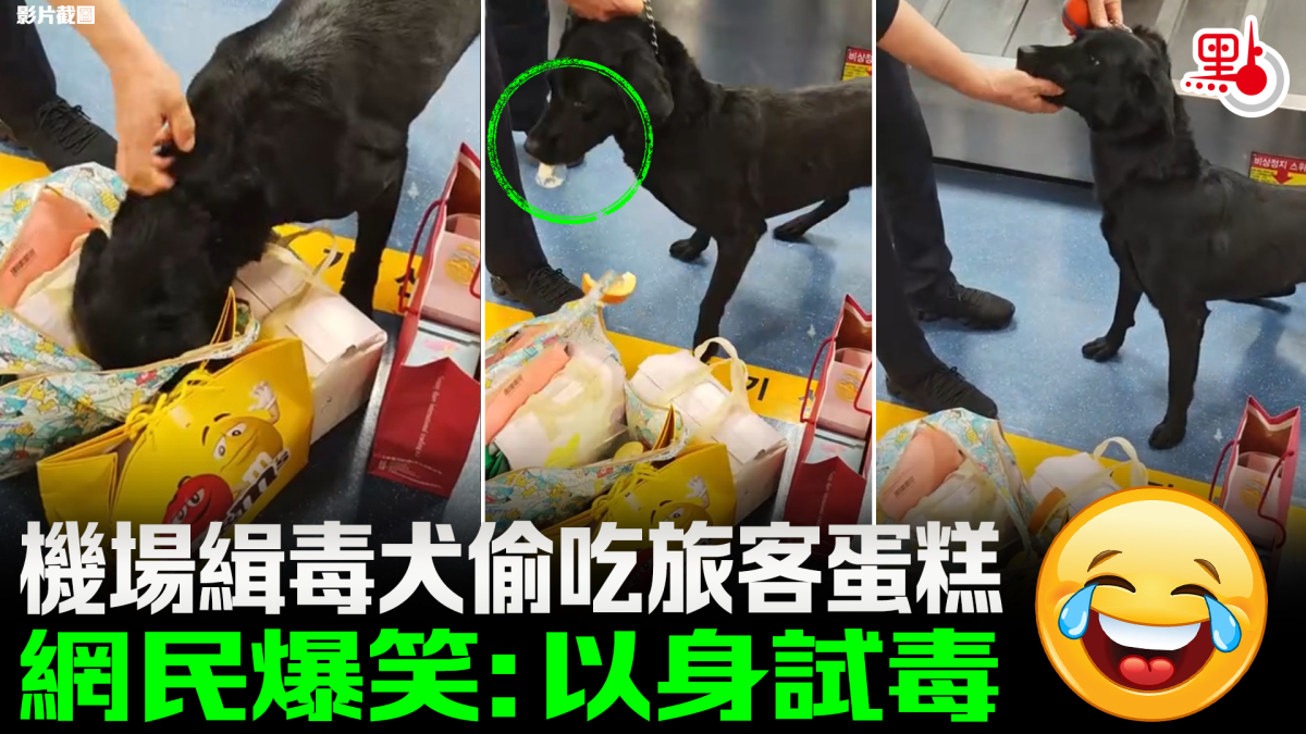 片段顯示,一隻黑色緝毒犬,當時正在行李傳送帶執勤,期間突然埋首一名旅客的購物袋內,在場的領犬員發現不對勁,將牠的頭拉出來,看到牠舌頭上沾滿了奶油,原來牠在偷吃旅客的奶油蛋糕。領犬員輕拍了緝毒犬一下,但蛋糕已被吃下肚,旅客則笑說「沒關係,狗狗一定是餓了。」
