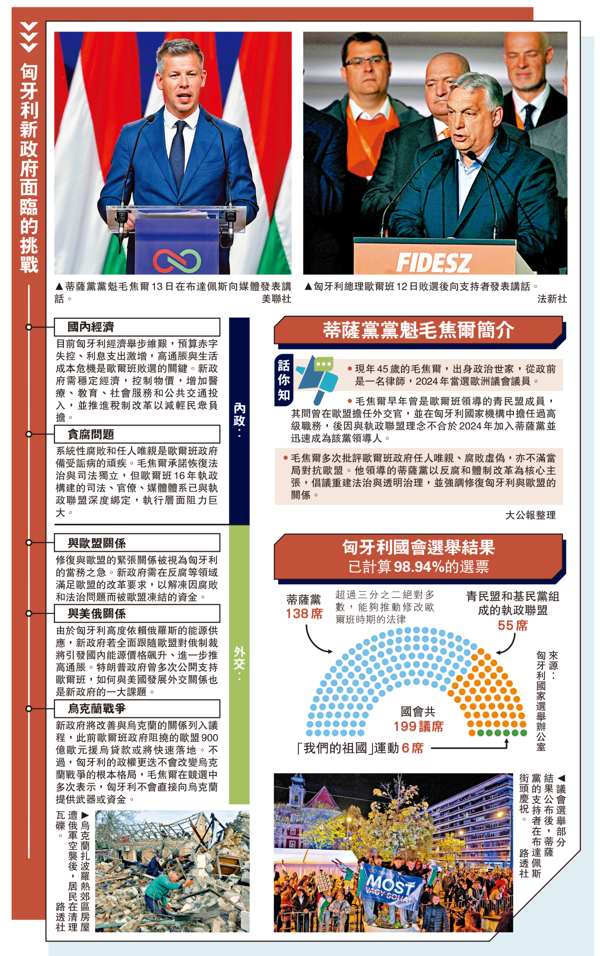 俄羅斯方面,克里姆林宮表示,俄方尊重匈牙利人民的選擇,希望與匈牙利新一屆政府建立「務實關係」。不過,俄總統特別代表德米特里耶夫則在社媒發文稱,歐爾班的敗選「只會加速歐盟的崩潰」,「4個月後再來看我說得對不對」。