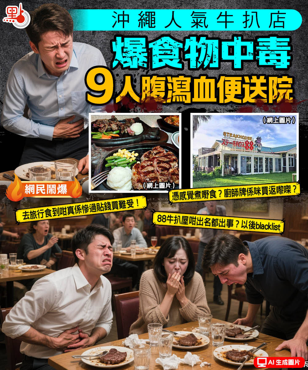 【點新聞報道】日本沖繩爆出嚴重集體食物中毒事件,9名顧客在知名餐飲集團「Steak House 88」用餐後,出現腹痛、血便等症狀,緊急送院,5間門市已被勒令停業。