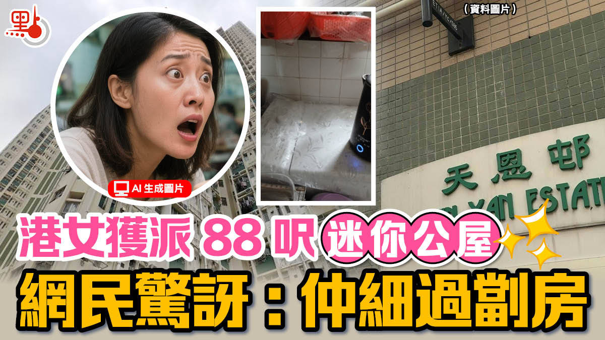 樓主日前在fb專頁「公屋討論區」發帖求助,稱「今日收到信派天恩邨恩慈樓88呎!但唔當一次想知洗衣機可放哪裏!還在考慮當中!謝解答!」。不少網民對公屋單位僅88呎感震驚,「仲細過劏房」、「仲細過個車位?人住?」、「同監倉一樣不過大八呎」。