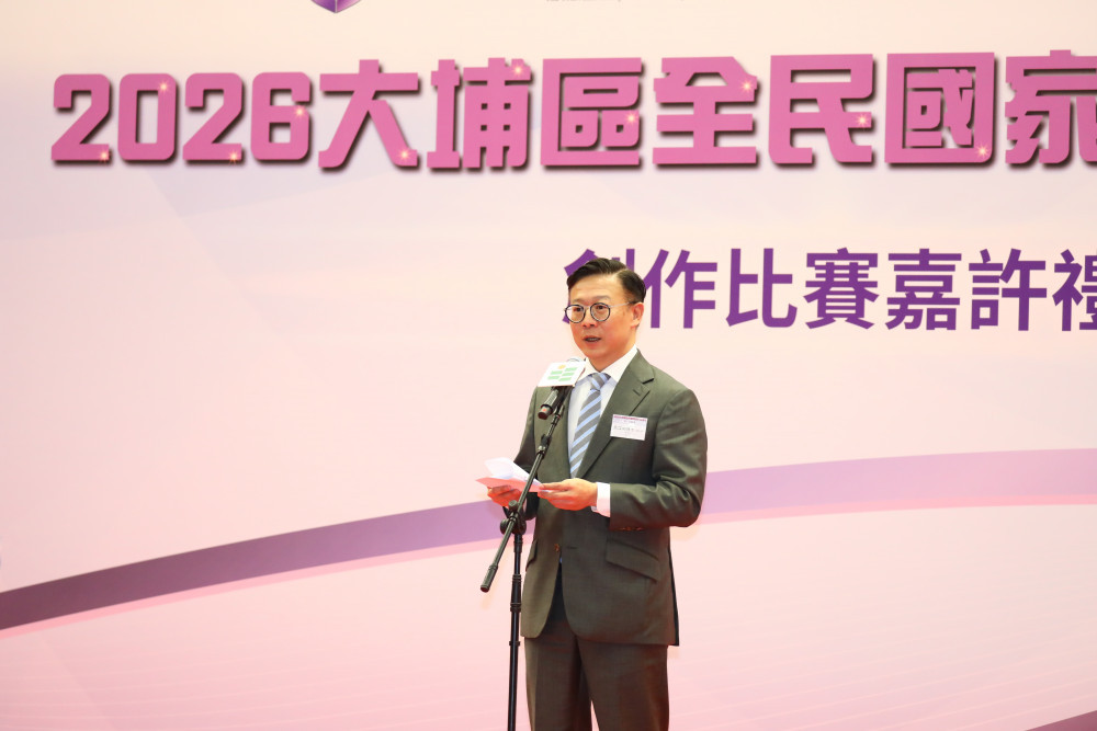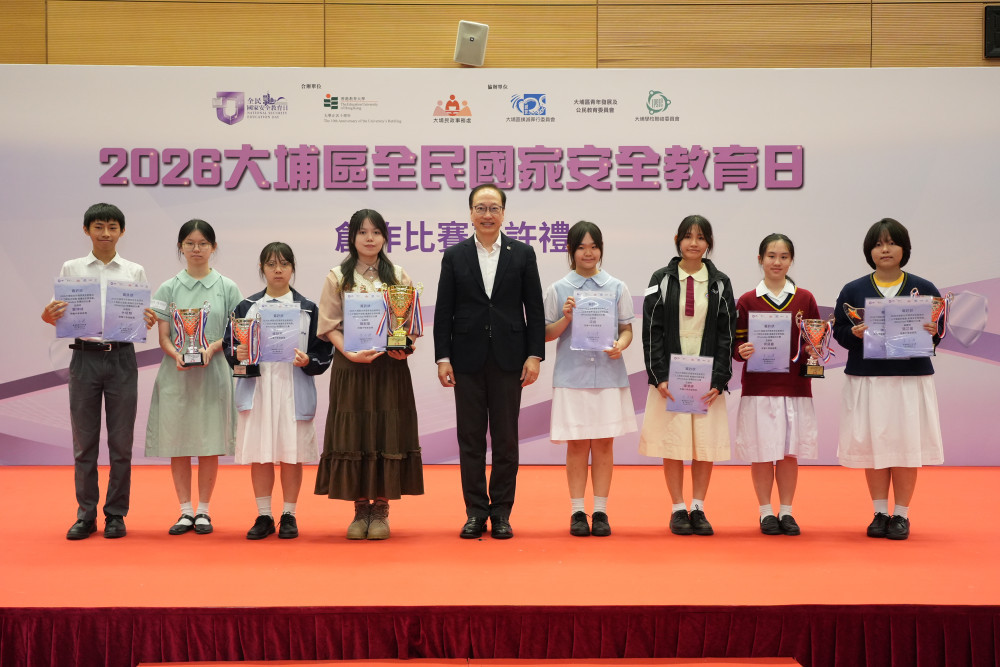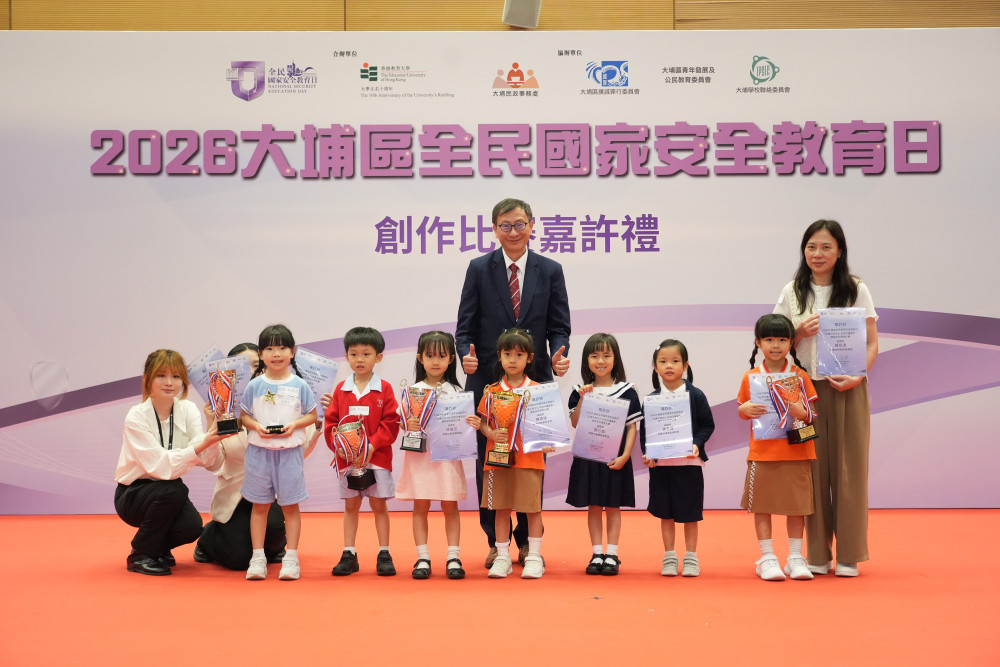 【點新聞報道】香港教育大學(教大)聯同大埔民政事務處,今日(4月14日)於教大大埔校園舉行「2026年大埔區全民國家安全教育日」創作比賽嘉許禮。出席活動的嘉賓包括律政司副司長張國鈞、駐港國家安全公署副處長張騰化、教大校長李子建、大埔民政事務專員鍾慧婷等,多位教育界及地區代表亦到場支持,一同見證學生的學習成果。