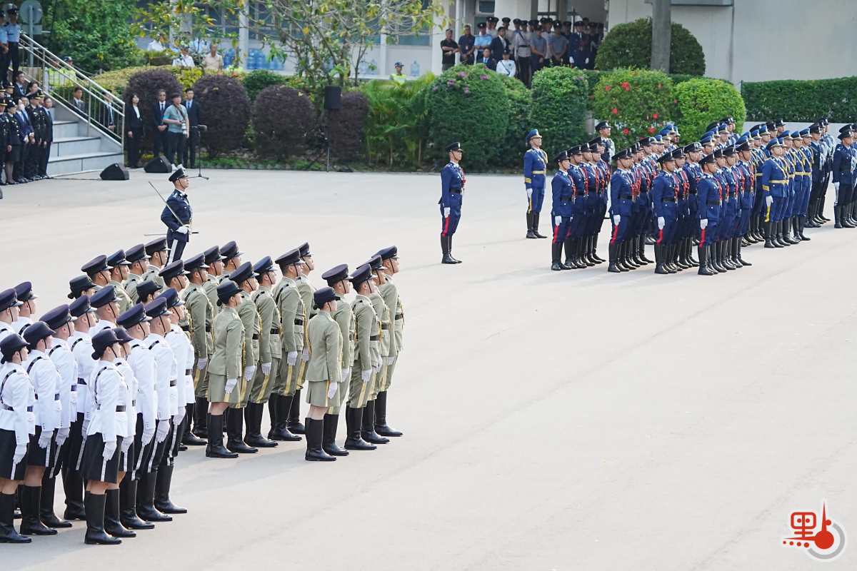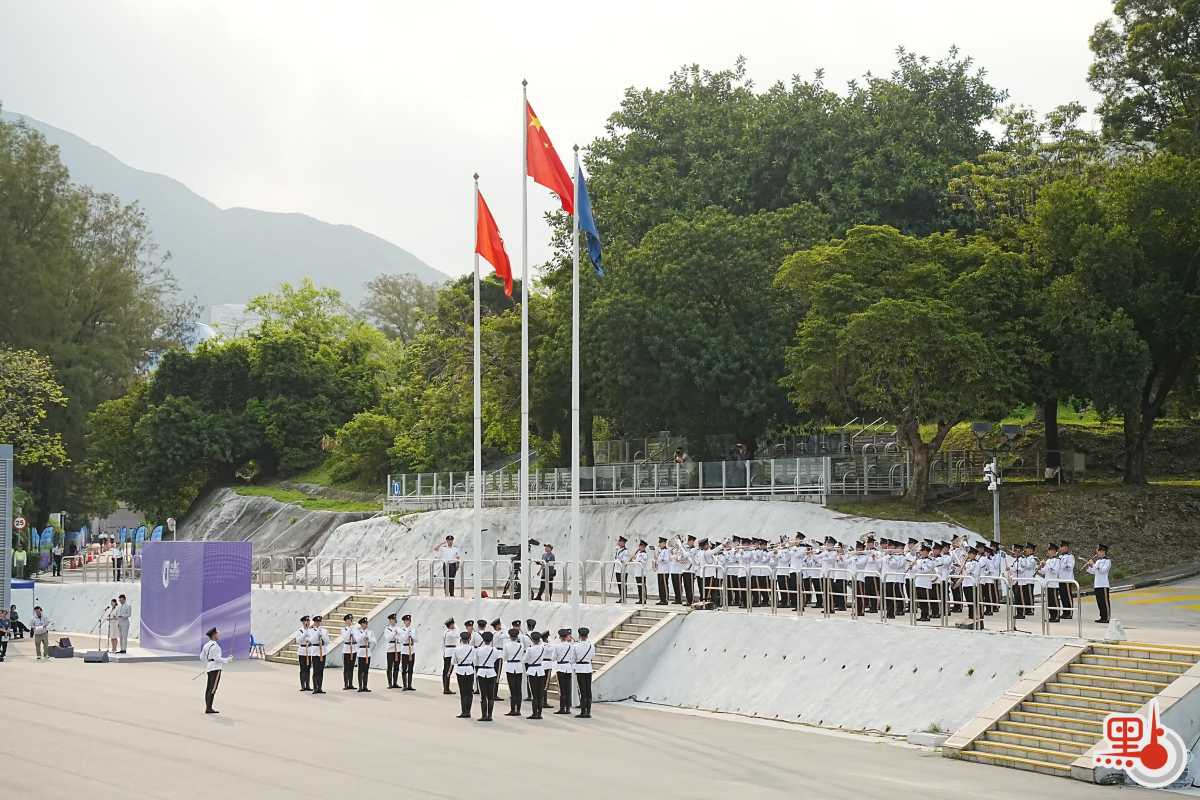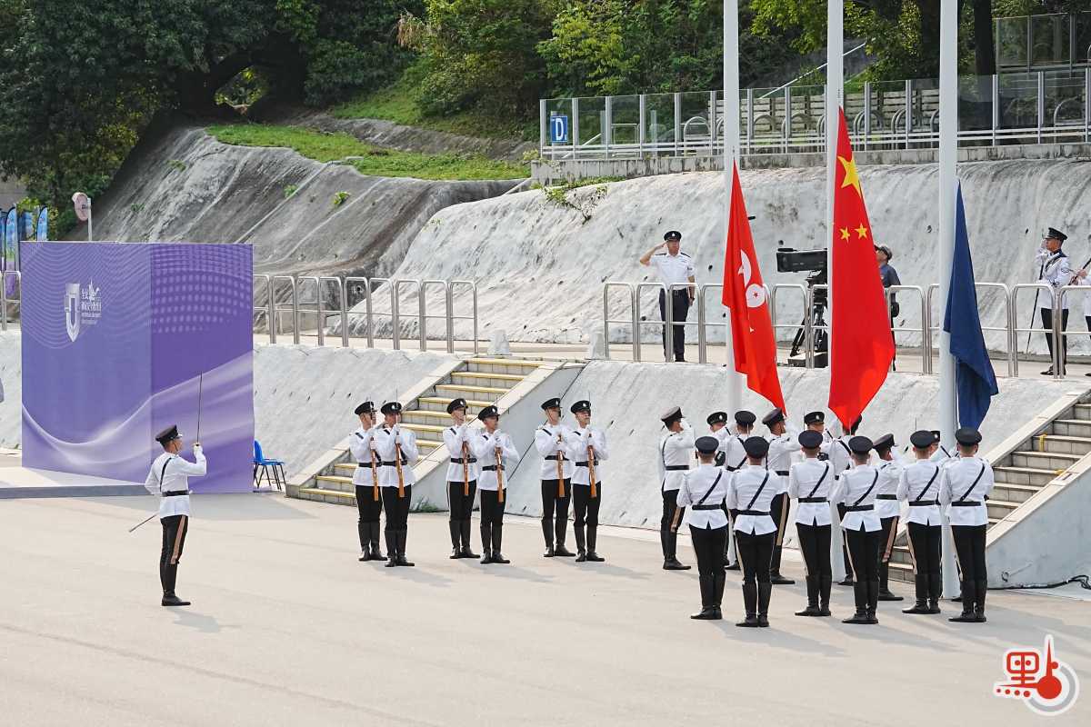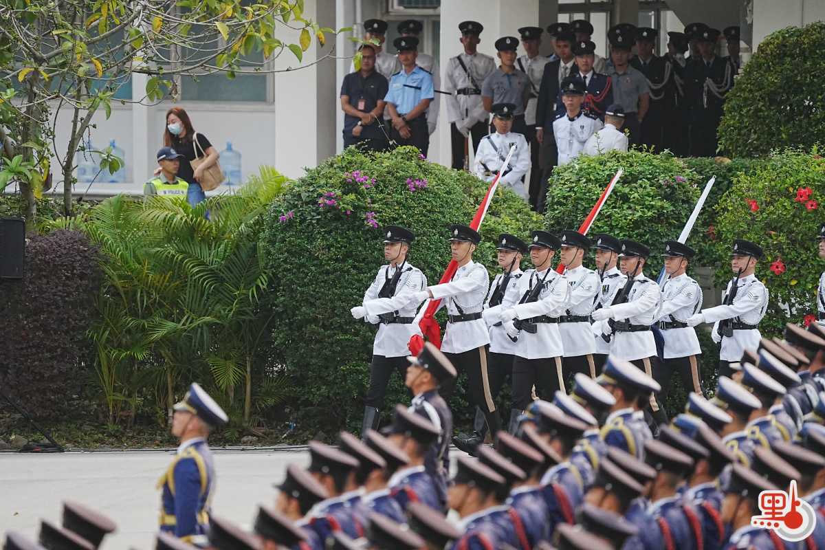 警察銀樂隊率先奏樂進場,表演多首樂曲,為儀式揭開序幕。紀律部隊儀仗隊隨後步操入場,警察護旗方隊升起國旗和區旗,現場奏唱國歌。升旗儀式結束後,政務司司長陳國基致辭。
