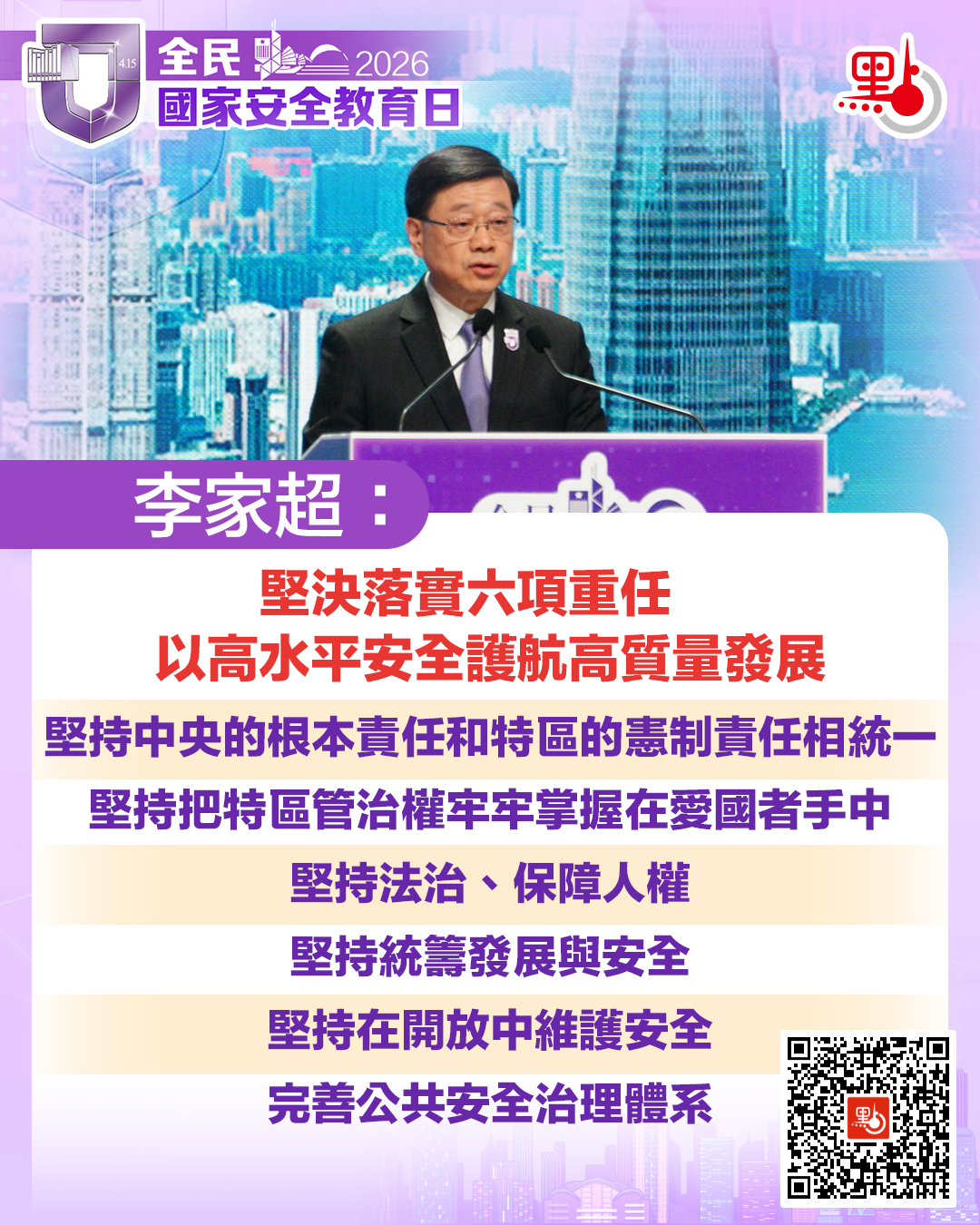 李家超指,今年的「全民國家安全教育日」正值國家「十五五」規劃開局之年,也處於香港開創新發展局面的關鍵階段。他感謝夏寶龍主任以視頻方式出席開幕典禮,並發表致辭。他表示,夏主任的致辭內涵豐富、論述深邃,全面闡明了香港維護國家安全與推動經濟社會發展的必然邏輯,深刻揭示了香港特區前進的道路方向,我們要深入學習貫徹夏主任致辭的核心要義和實踐要求,砥礪奮進,勇毅前行。