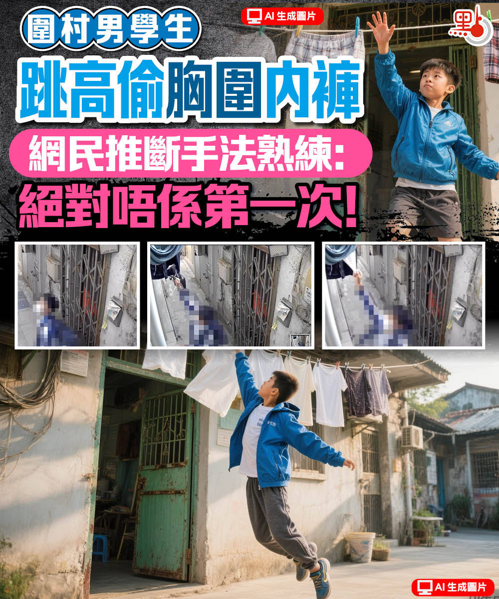 片段顯示,一名穿藍白色外套、孭深灰色書包、戴口罩的男中學生,行經村屋單位時,抬頭望向晾在室外的衣物,再視察四周環境後,便躍高伸手將懸掛在高處的胸圍連衣架扯下,隨後若無其事地離開。約半分鐘後,該男生竟去而復返,再度跳起扯下一條白色內褲,之後再跳起兩次,其中一次扯下另一條白色內褲,才離開現場。
