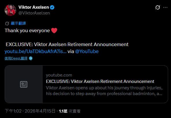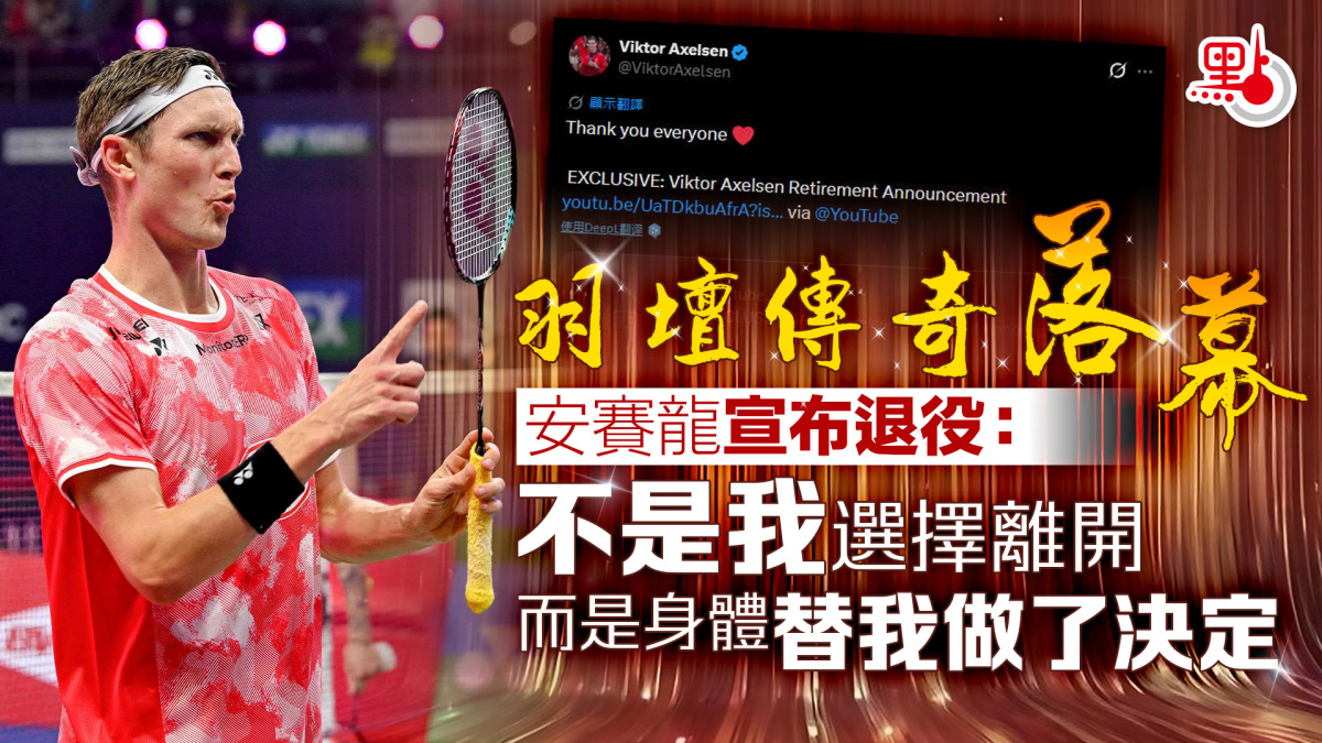 【點新聞報道】2026年4月15日,丹麥羽毛球名將安賽龍(Viktor Axelsen)通過個人社交賬號發布簡短致謝訊息,正式宣布從國際羽壇退役,這一消息隨後在全球羽壇迅速傳開。儘管世界羽毛球聯合會及丹麥羽協尚未發布官方聲明,但由於本人親自確認,已被視為其職業生涯的最終定論。