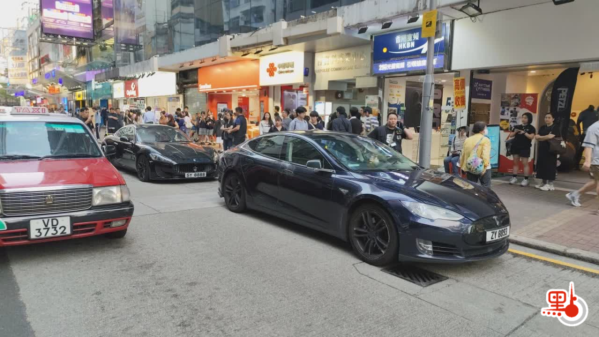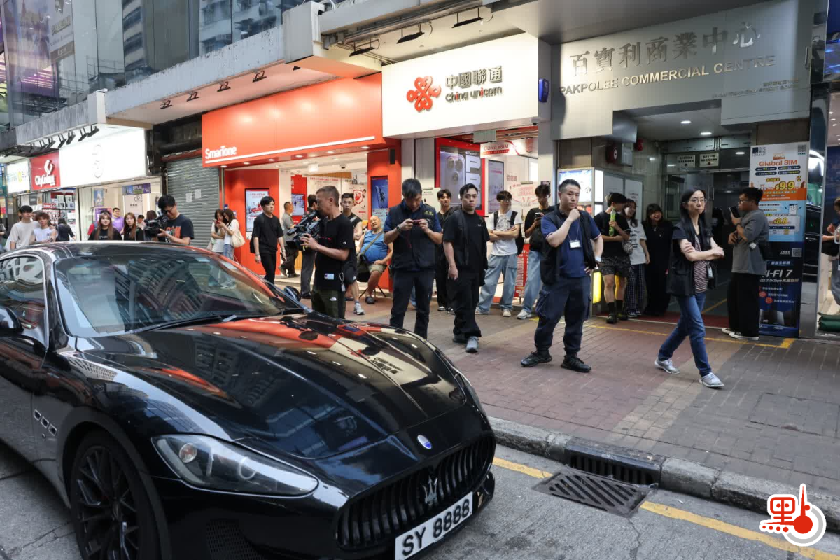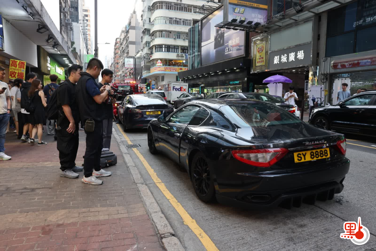 【點新聞報道】網上流傳一條片段,顯示今日(15日)下午大批探員在旺角西洋菜南街1號福泰大廈對開截查一輛車牌「SY8888」的黑色瑪莎拉蒂跑車,車旁有兩名男女被用黑布頭套蒙頭協助搜查車輛。