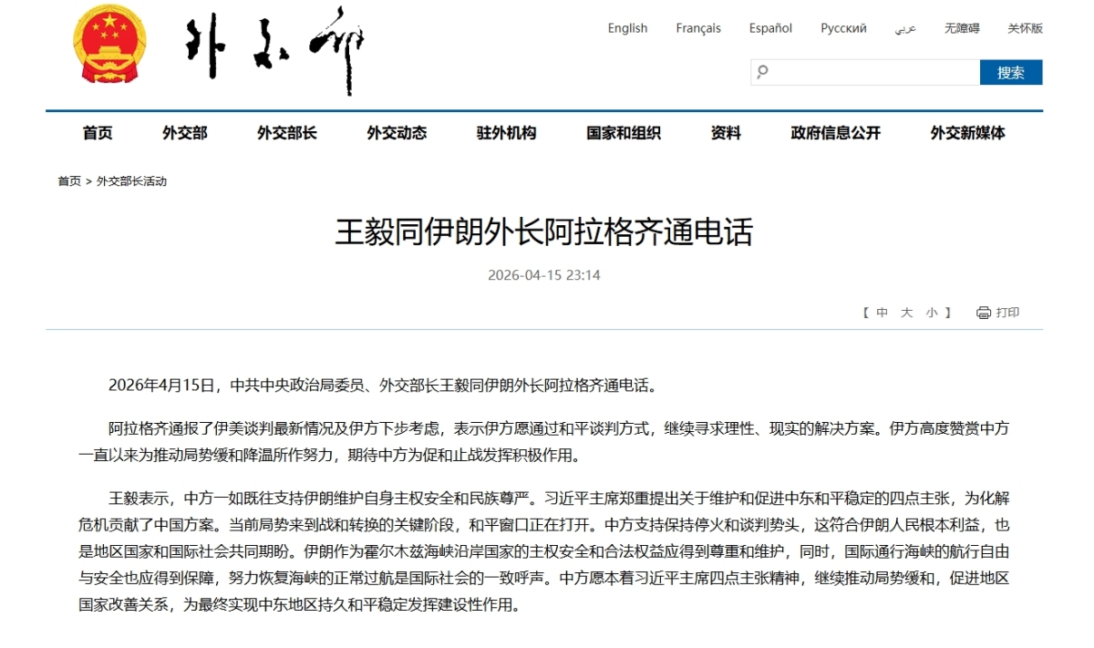 【點新聞報道】據央視新聞報道,中共中央政治局委員、外交部長王毅15日同伊朗外長阿拉格齊通電話。