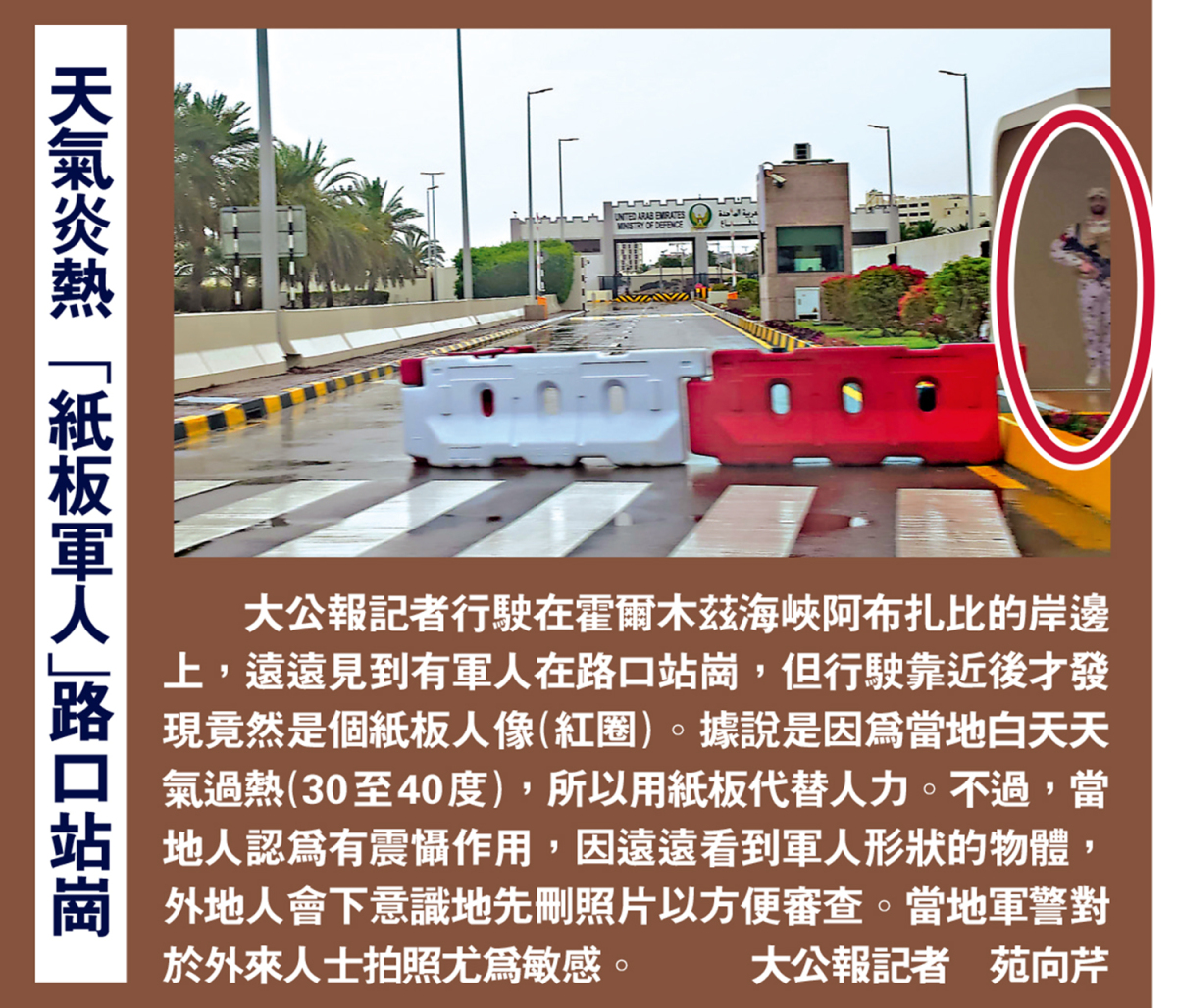 從記者所在的拉斯海瑪一路往北,是位於阿拉伯半島東南沿海的阿曼蘇丹國(阿曼)。實地觀察,連結兩國的,是一幢四層樓高的邊境檢查站,裏面駐守了不少軍隊,延綿數百米,幾乎全是貨車,既不能過檢,也不准通行。