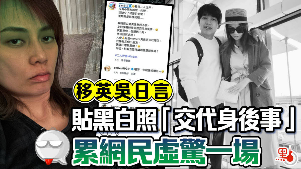 【點新聞報道】已舉家移民英國的過氣歌手吳日言,近日突然在IG貼出與老公的黑白合照,並提到「交代身後事」,嚇壞不少網民,其後才發現只是虛驚一場。