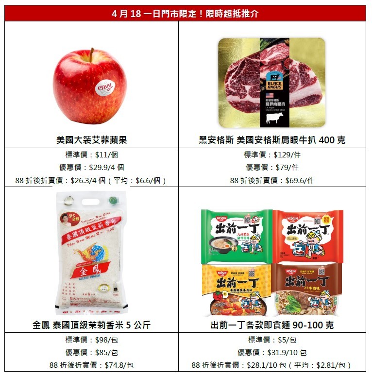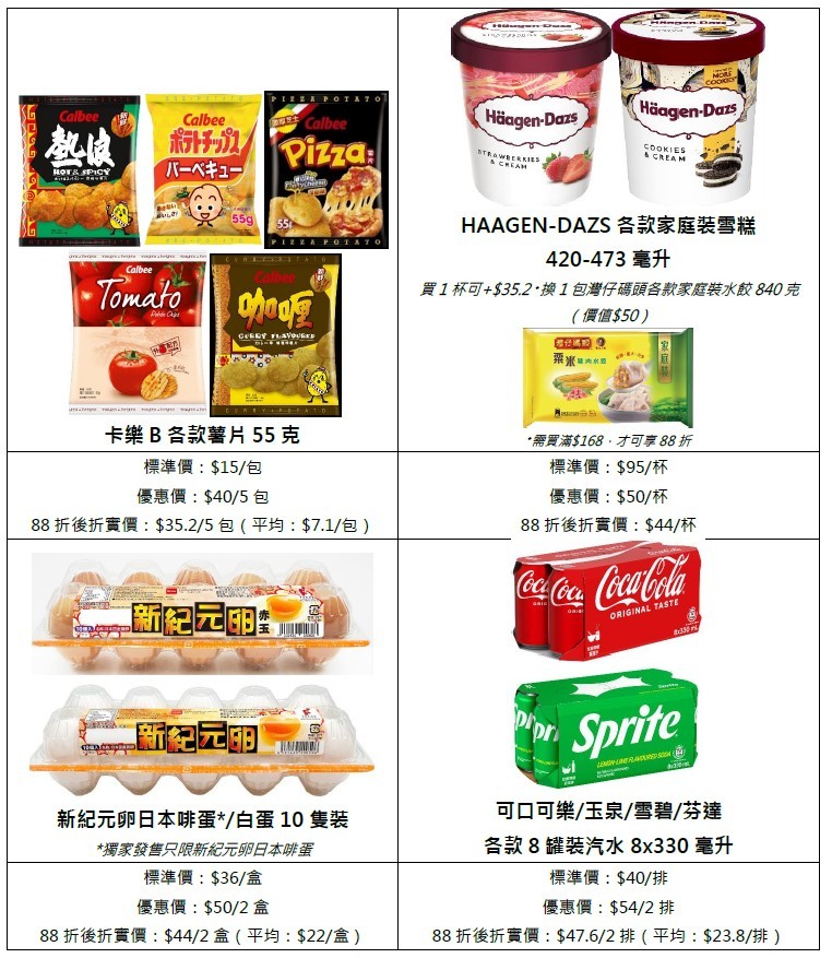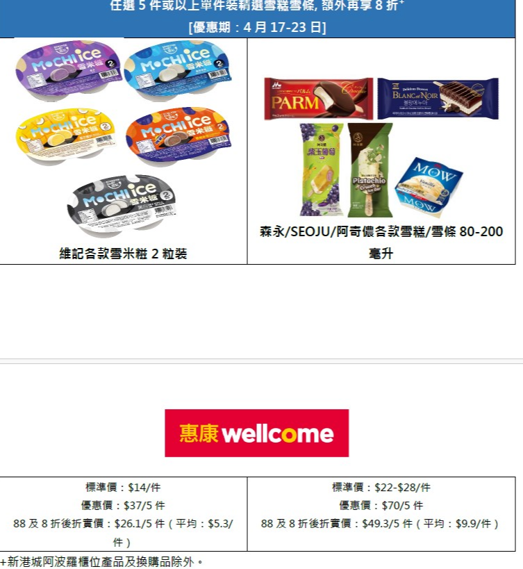 4月17日至23日一連七天門市限定,任選5件或以上單件裝雪糕雪條,即享8折優惠,可與4月18日門市買滿$168「全場88折」快閃優惠疊加使用,實行折上折,越買越抵!記得把握黃金時機,今個周六親臨惠康搶盡優惠,滿載而歸!
