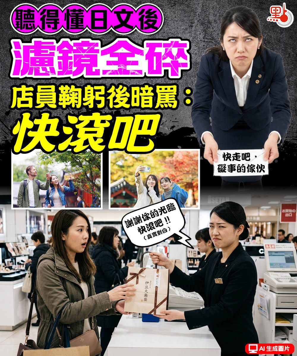 不少網民都分享自身經驗,「自由行去過幾次真的覺得日本人都笑笑的,假裝態度很好,但其實可以感覺到他們的惡意」、「結帳完後日本服務員很客氣和你鞠躬行禮,然後來一句『謝謝你的光臨快滾吧』」、「結帳完後日本人店員笑笑地對我們鞠躬,嘴裡卻用日文說『快走吧,礙事的傢伙』,我用日文回『我聽得懂日文』」、「聽懂日語,會發現很多日本人其實很愛嘲笑人,性格差」、「上次獨自去迪士尼,結果排隊的時候被後面兩位日本阿姨狠狠羞辱,『怎麼會一個人來迪士尼,好可憐,沒朋友嗎,被男友甩了吧』」、「在天王寺二手攤位看飾品問價格,被老闆說不買就滾出去」。