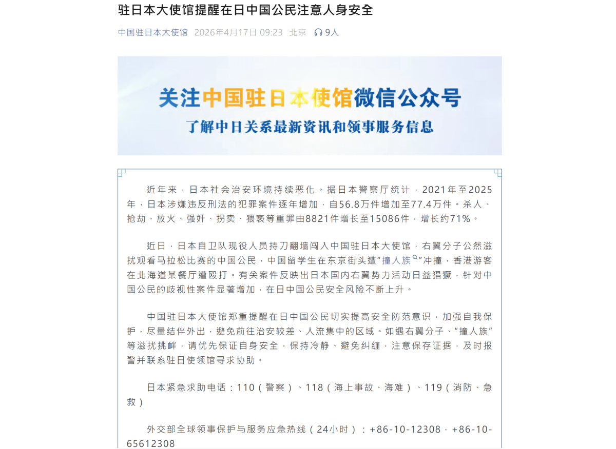 【點新聞報道】4月17日,中國駐日本大使館發文提醒在日中國公民注意人身安全。全文如下: