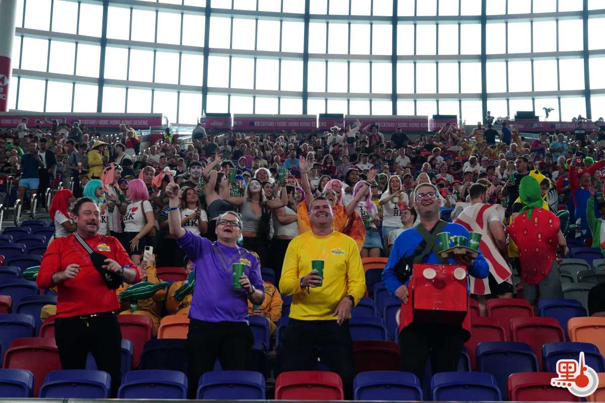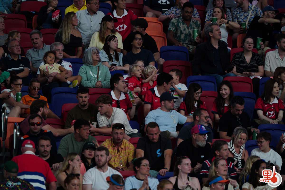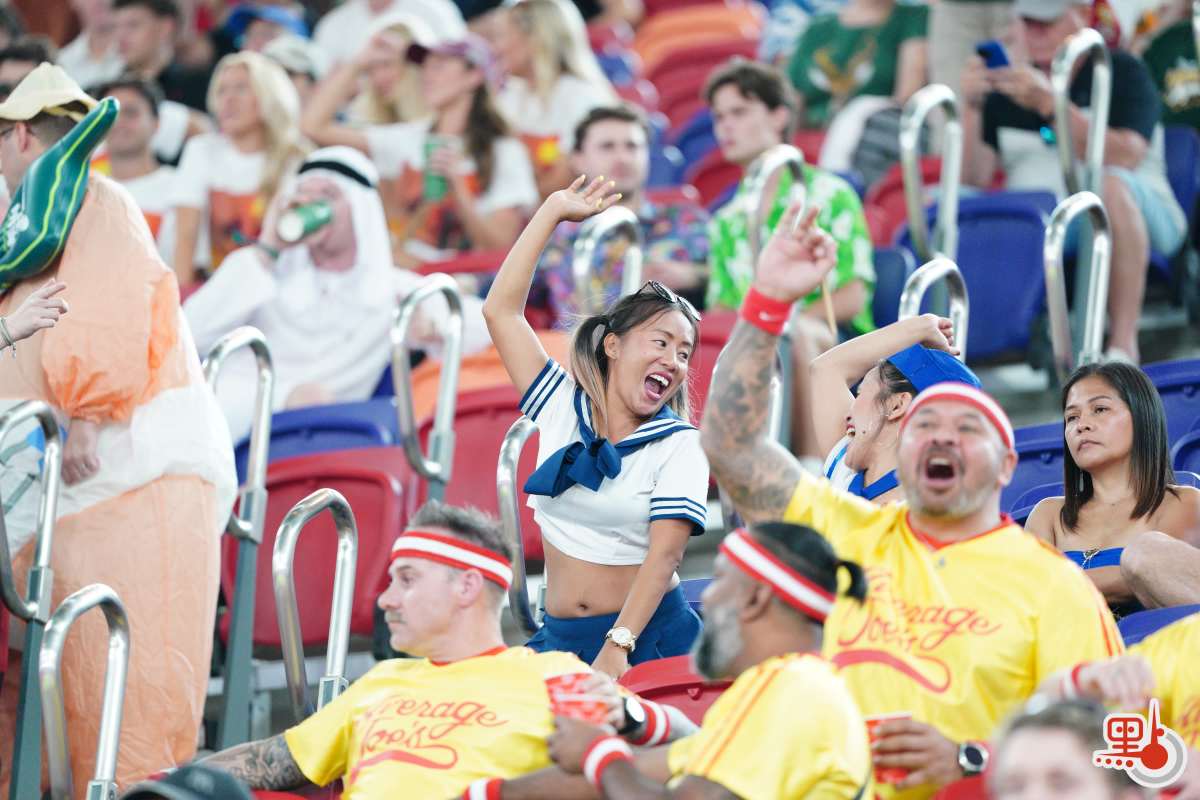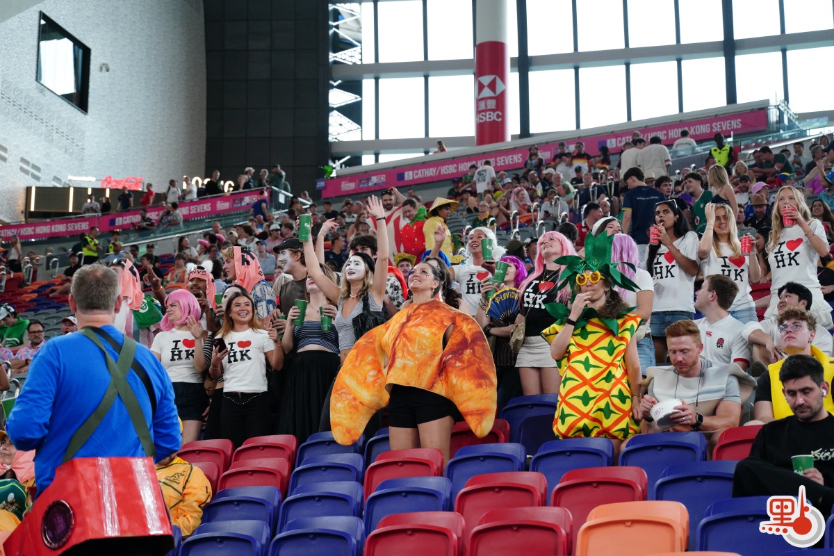 球賽未開打已有熱烈氛圍。國際七人欖球賽的球迷有盛裝打扮、「扮鬼扮馬」的「傳統」,這股氛圍今年同樣席捲啟德。點新聞記者現場所見,不少球迷扮成孖寶兄弟等經典角色,亦有球迷扮成水果、飲料等食物,還有不少球迷穿着「我愛香港(I love HK)」T恤衫。一眾盛裝打扮的球迷更在看台上大合唱,支持球隊,high爆現場!